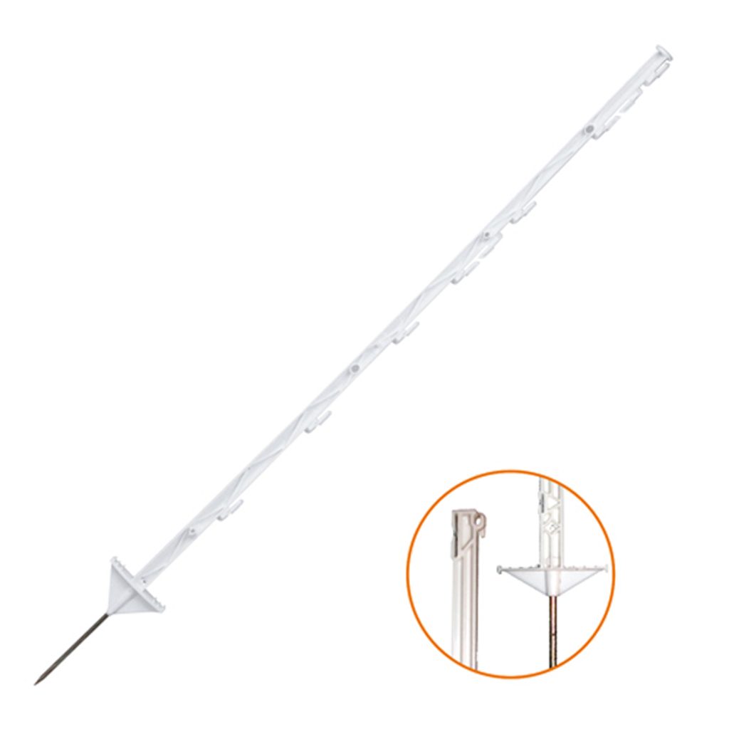 Plastový mobilní ohradníkový sloupek s kovovým bodcem a úchytkami na vodivou pásku, výška 130 cm. Vhodný pro dočasné oplocení a předěly ve stálých ohradách. UPOZORNĚNÍ: Zboží nelze posílat.