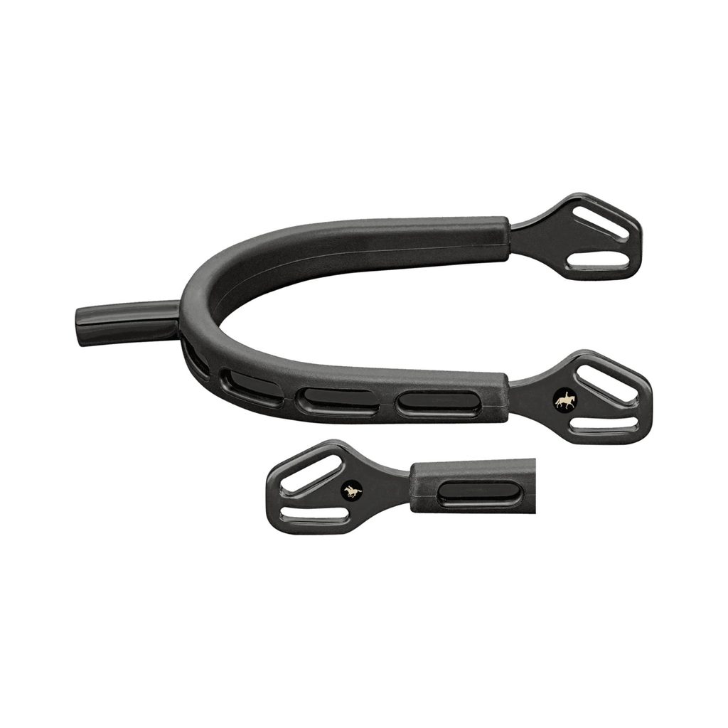 Speciální gumový povrch (Extra Grip) zajišťuje pevné usazení na botě, zabraňuje sklouzávání a zároveň chrání kůži jezdecké obuvi. Komfort zvyšuje i inteligentní vedení řemínku, které přispívá k ideálnímu uchycení.
