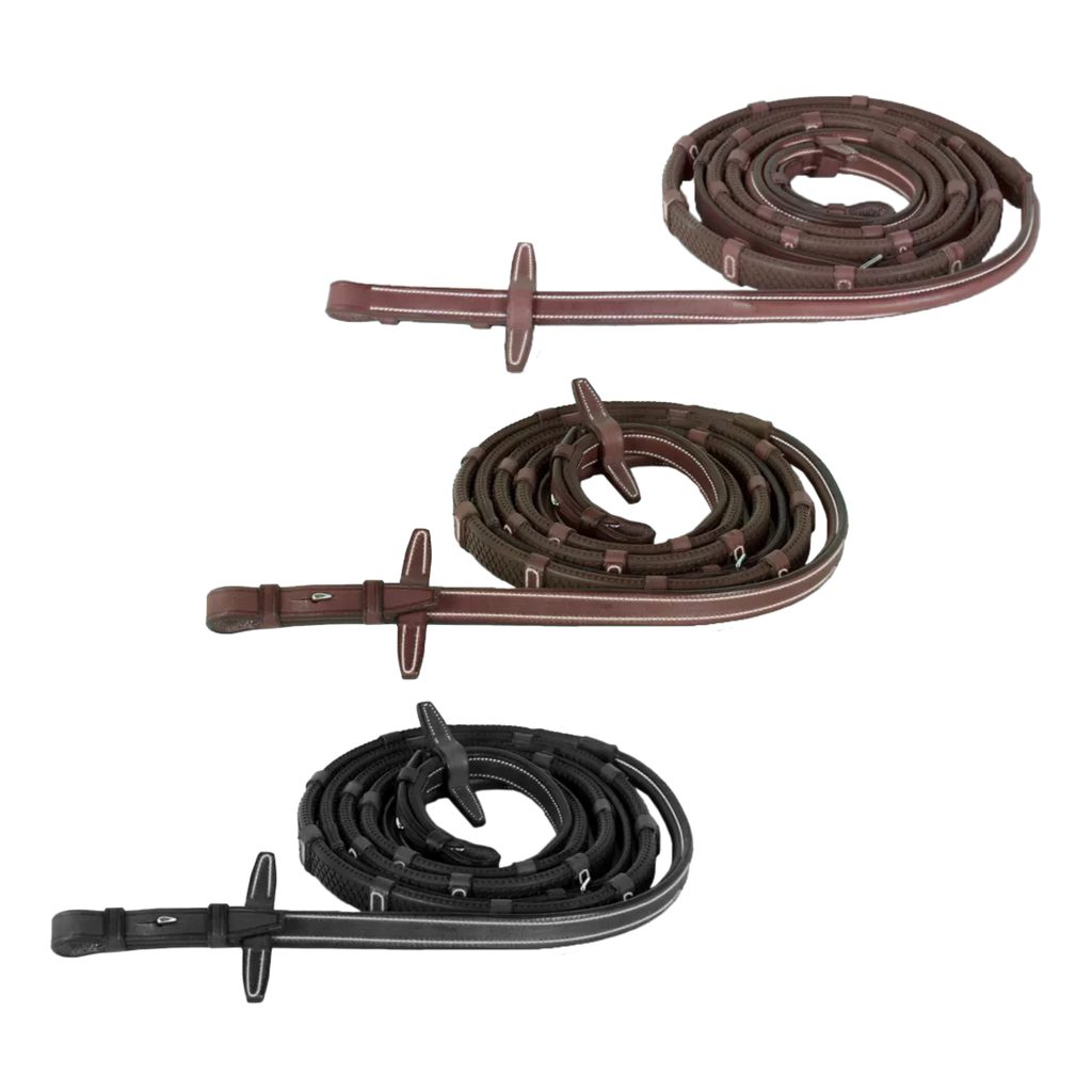 Jsou vyrobeny z kombinace pryže a rostlině činěné teletiny. Jsou vybaveny četnými koženými zarážkami, které poskytují lepší oporu v ruce a navíc zaujmou svým kontrastním prošíváním. Dvojitá tloušťka teletiny zajišťuje lepší pevnost. Snadno se připevňují k udidlu díky zapínání na háčky. Pro elegantní vzhled jsou zakončeny ½ kulatou prošívanou kůží. Samozřejmostí jsou zarážky na martingal.