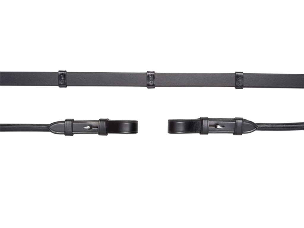 Kvalitní kožené otěže se zarážkami. Oblíbené elegantní kulaté provedení. Barva černá/stříbrné kování, zapínání na háčky na straně ke koni, délka Full. Kvalita od Schockemoehle.