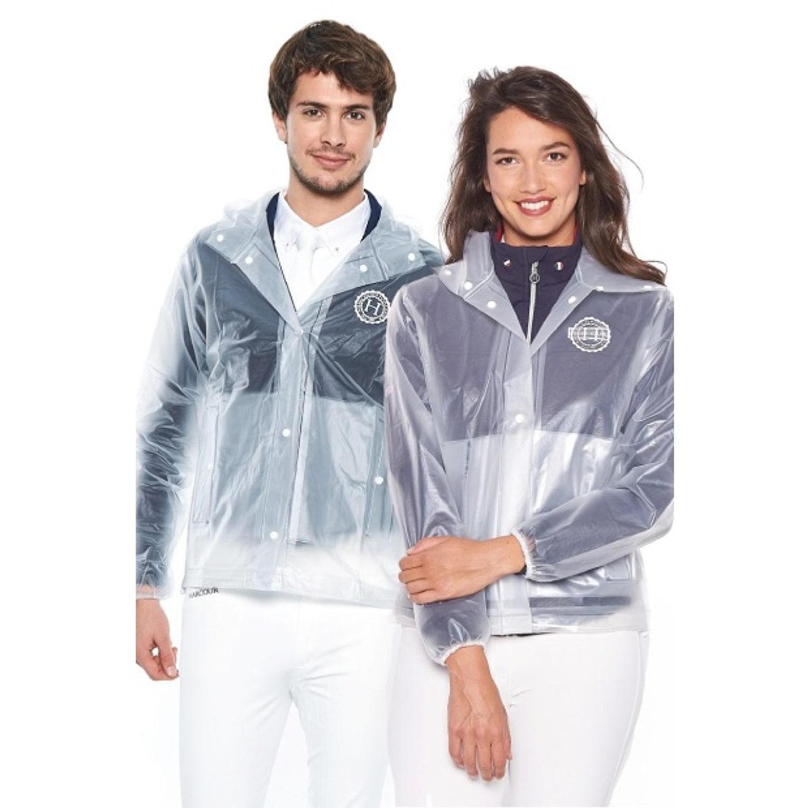 Univerzální krátká pláštěnka pro jezdce. Pláštěnka je samozřejmě nepromokavá a v zajímavém průhledném designu. Zapínání na cvočky a tištěné logo na hrudi. Unisex. Barva: transparent. Velikosti: XS,S, M, L, XL.