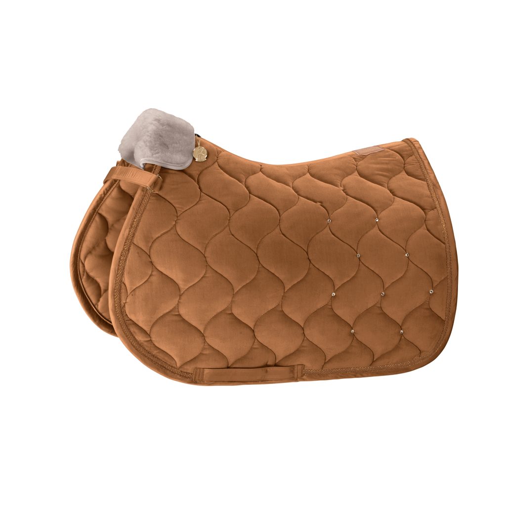 Sametová podsedlová dečka zdobená kamínky a nadýchanou umělou kožešinou v oblasti kohoutku. Spodní strana je z materiálu Cool-Dry. Umělá kožešina u kohoutku je připevněná na suchý zip. Poutka nabízejí přesnou fixaci k sedlu.