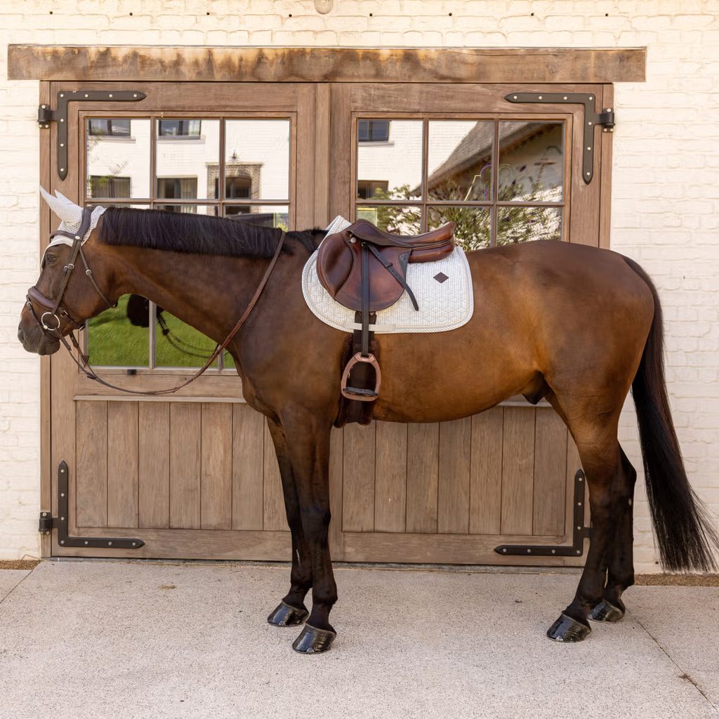 Design je doplněn o nadčasové prošívání, které nejen skvěle vypadá, ale zároveň přispívá k optimálnímu rozložení tlaku pod sedlem. Dvojité kroucené lemování podtrhuje precizní zpracování a luxusní charakter. Spodní strana je vybavena prodyšnou, rychleschnoucí podšívkou, která efektivně odvádí vlhkost a zajišťuje maximální komfort pro koně při každém tréninku i závodech. Je navržena bez poutek k sedlu, takže perfektně drží na svém místě bez zbytečných popruhů.