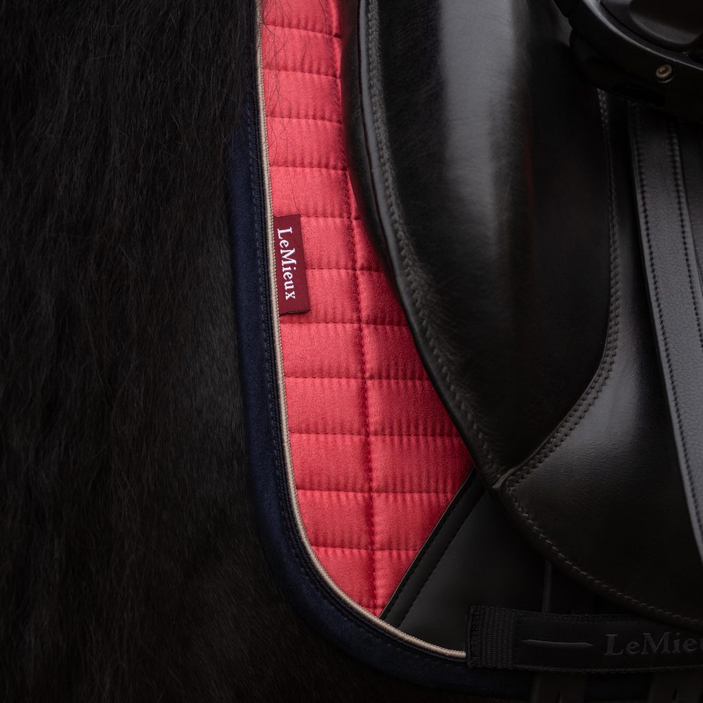Luxusní podsedlová dečka LeMieux Suede Square má semišový povrch, který působí elegantně a snadno se udržuje, zatímco podšívka z bambusové směsi odvádí pot, je antibakteriální a rychleschnoucí. Konturované lemování zabraňuje deformaci a zesílená oblast pod podbřišníkem chrání dečku při každodenním ježdění.