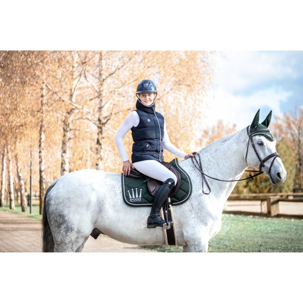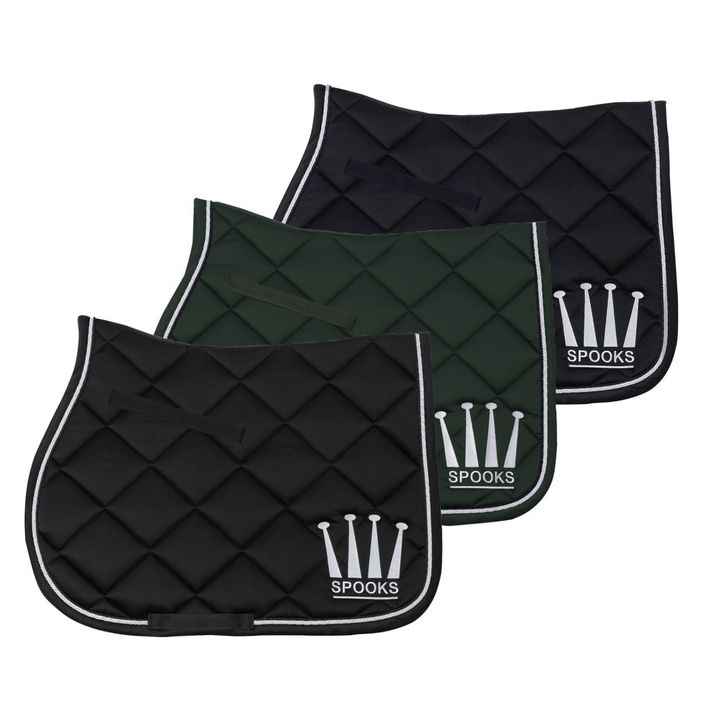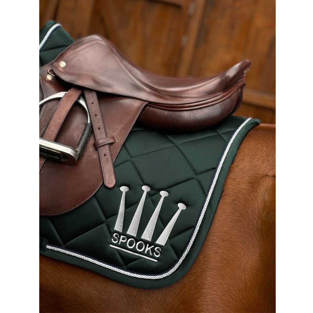 Lesklá podsedlová dečka, kterou zdobí vyšité korunky SPOOKS a dvojité lemování. Samozřejmostí je anatomicky tvar. Nylonová poutka na protažení podbřišníku a pro připevnění k sedlu.