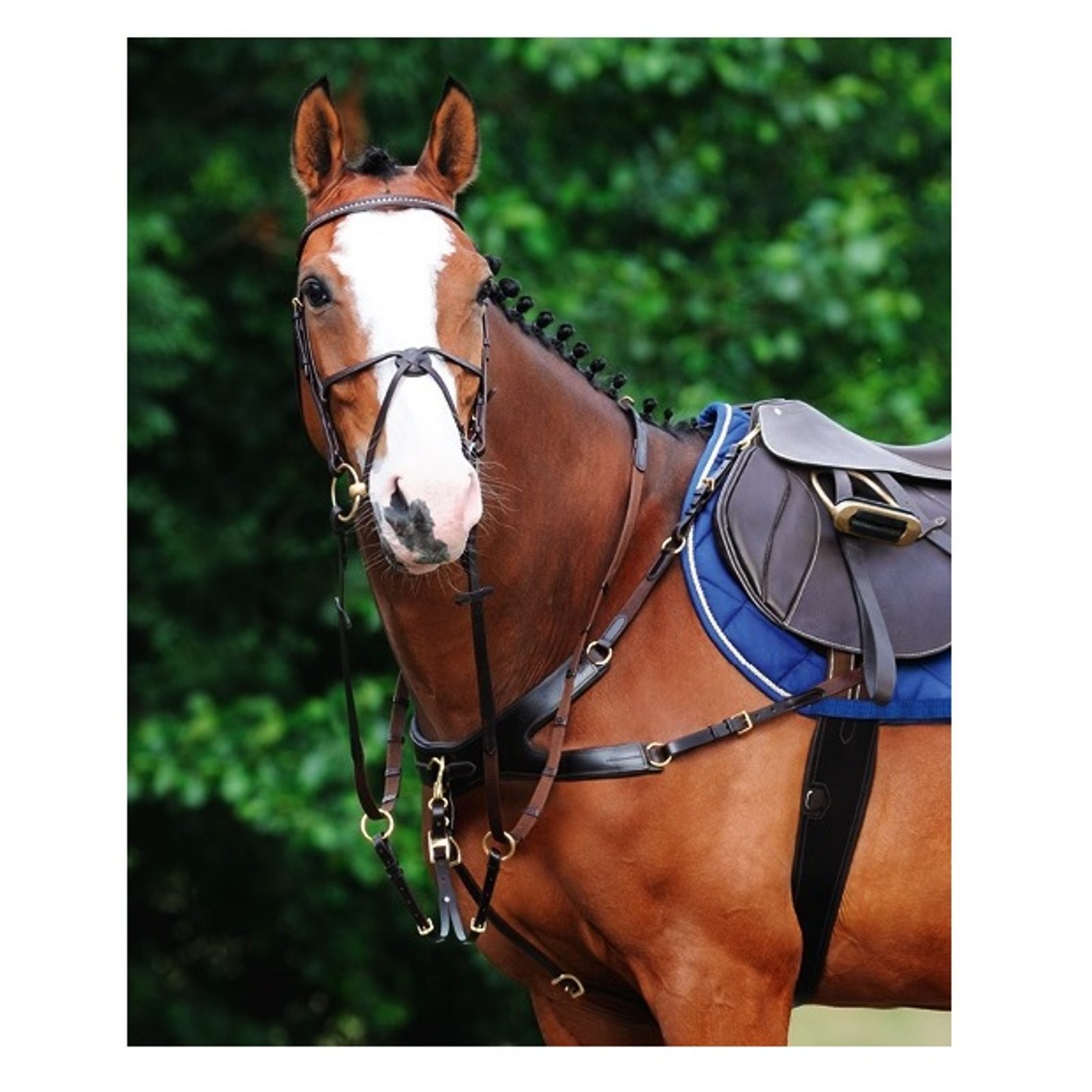 Perfektně propracovaný poprsák, který opravdu zabrání sjíždění sedla dozadu, včetně fáze odskoku. Díky anatomickému tvaru poskytuje koni maximální volnost pohybu v ramenou a eliminuje tlakové body. Součástí je odnímalená martingalová vidlice. Velikost: univerzální Cob/Full - variabilní nastavitelnost. Barva: černá.