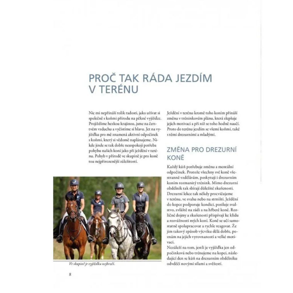 Klimke sdílí své bohaté zkušenosti a znalosti o bezpečném a pestrém ježdění v terénu za všech povětrnostních podmínek a v různých ročních obdobích. Od bezpečných vyjížděk přes brodění vodních překážek, gymnastické procvičování drezurních koní v přírodě, kondiční tréninky až po zdolávání prvních nízkých terénních překážek, tato kniha slouží jako komplexní průvodce pro jezdce všech úrovní. Klimke přistupuje k tématu s respektem k přírodě, koním a jezdectví jako umění. Tato kniha není jen o technikách a tréninku, ale také o budování vztahu s koněm a užívání si nezapomenutelných zážitků v srdci přírody.