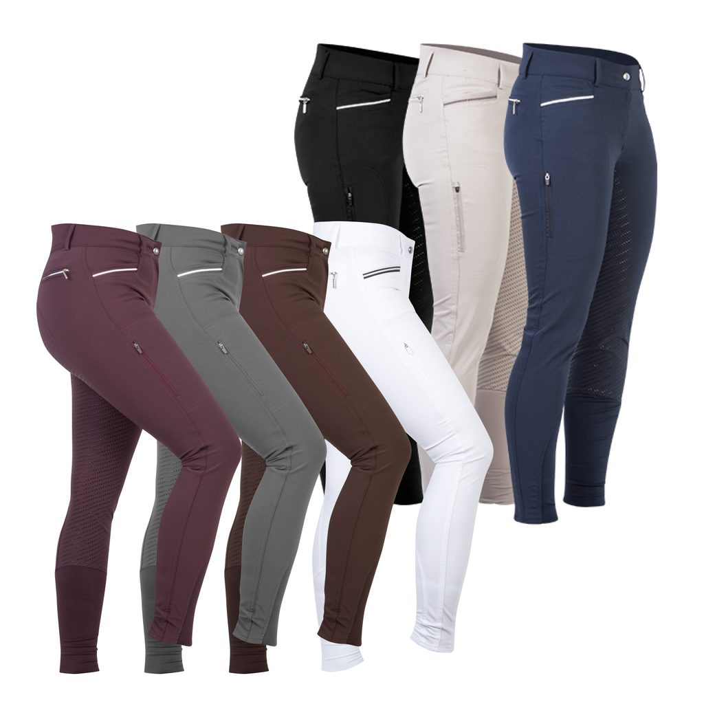 Velmi příjemné dámské rajtky s celogripovým sedem. Praktický je výrazně zvýšený pas vzadu, který ochrání bedra proti ofouknutí. Uvnitř pasu je grip, ten zajistí, že se vám zastrčené tričko nebude vytahovat, vzhled tak bude i při pohybu vždy perfektně upravený. Co určitě oceníte, je velmi pružný a přizpůsobivý materiál, který kopíruje vaše pohyby. Rajtky se skvěle hodí na jaro, léto i podzim. Pro drobnosti můžete využít dvě přední otevřené kapsy, na telefon je určená kapsa na zip na pravém stehně, zadní kapsa na zip je pouze ozdobná. Zakončení nohavic je také z pružného a jemnějšího materiálu, díky tomu se snadno oblékají a perfektně sedí pod vysokými jezdeckými botami. Celogripový sed vám dodá v sedle příjemnou stabilitu.