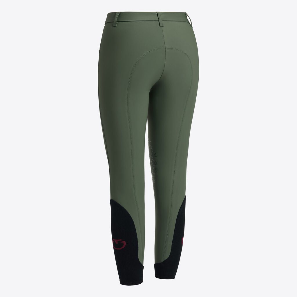 Speciální silikonové gripy v oblasti kolen poskytují maximální stabilitu v sedle, zatímco elastické „sock“ panely na spodní části nohavic se dokonale přizpůsobí a pohodlně se nosí pod jezdeckými botami. Kontrastní logo Cavalleria Toscana na boku dodává rajtkám moderní a sportovní vzhled.