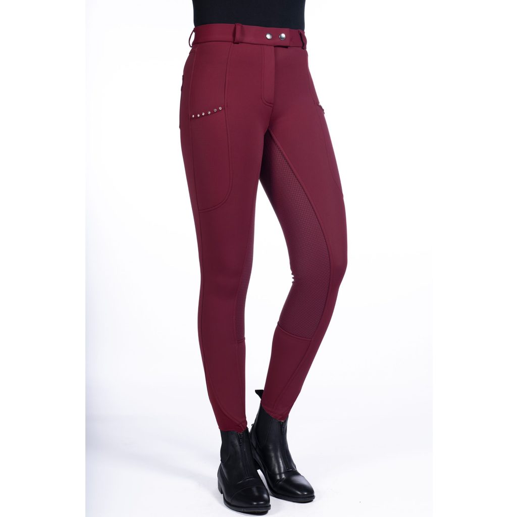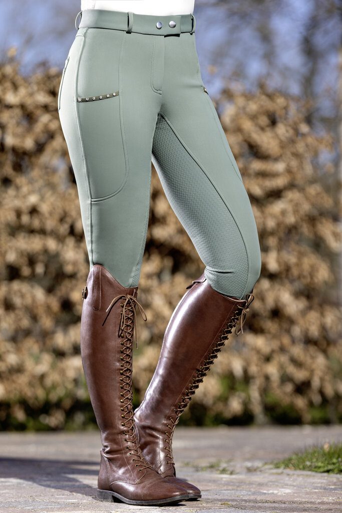 Dámské zimní jezdecké rajtky s celogripovým silikonovým sedem. Vnější strana je hladká a vnitřní měkká a hřejivá. Spodní část nohavic je elastická pro příjemné oblékání a skvěle sedí pod vysokými jezdeckými botami. Na obou stehnech je kapsa na telefon, která je zdobená třpytivými kamínky. Dvě zadní kapsy. Celogripový sed zajišťuje skvělé protiskluzové vlastnosti.