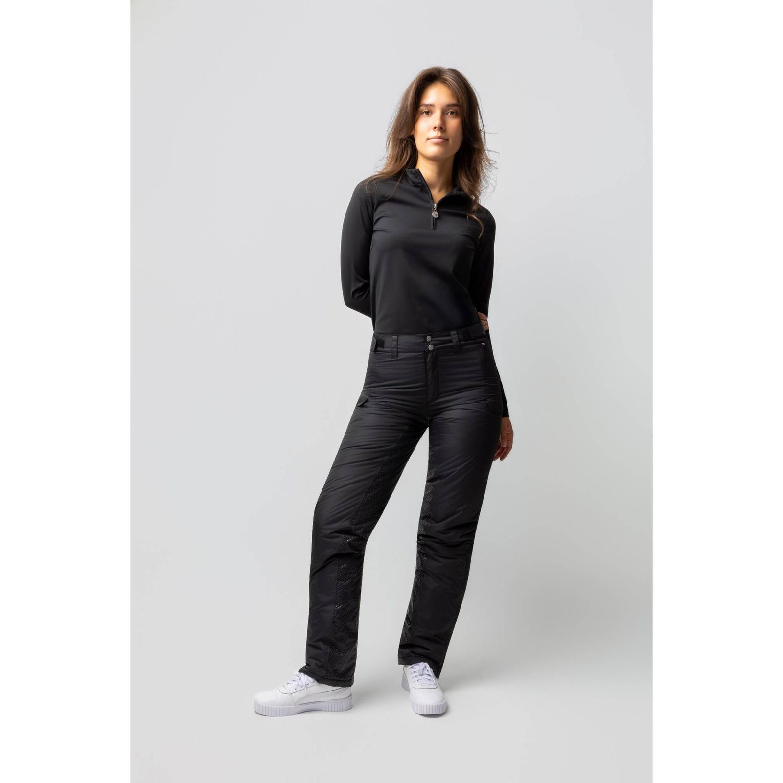Vysoký pas se zvýšenou zadní částí zaručuje komfort a ochranu zad proti chladu. Díky nastavitelnému pasu na suchý zip a odnímatelným elastickým páskům pod nohavicemi si je snadno přizpůsobíte vlastnímu pohodlí. Praktické kapsy na stehnech na suchý zip a zipy na nohavicích až po koleno umožňují snadné oblékání přes termo vrstvy či jezdecké boty.