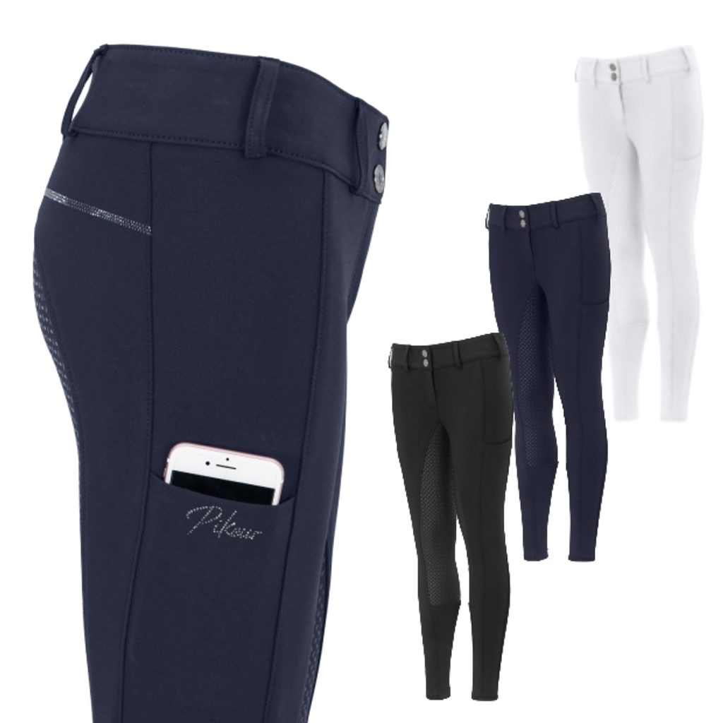 Dívčí rajtky s celogripovým silikonovým sedem. Rajtky mají tvarovaný pas, ozdobné třpytivé lemování kapes, kapsy na stehně na telefon, z kamínků vyskládané logo Pikeur na kapse. Díky celogripovému sedu je v sedle zajištěná příjemná stabilita. Barva: bílá, černá, tm.modrá. Velikosti: 140, 146, 152, 158, 164, 170, 176.