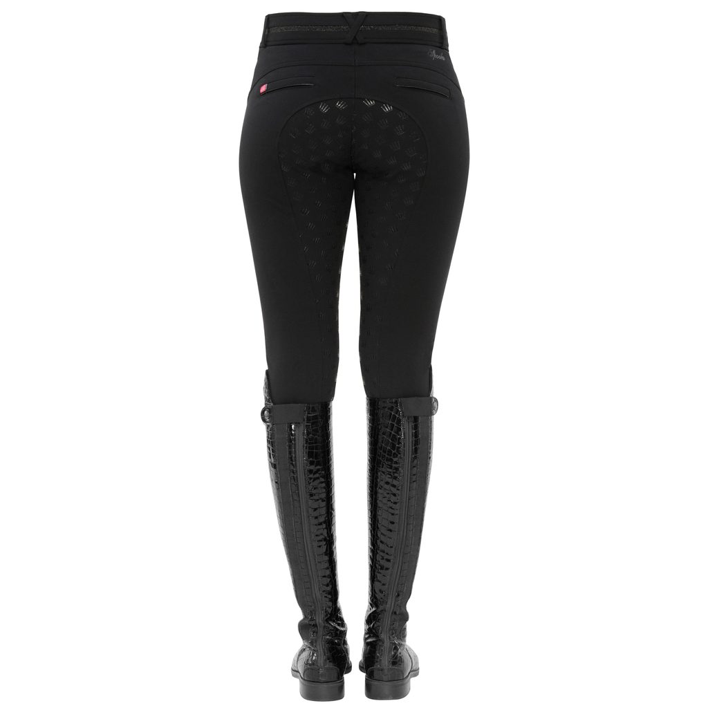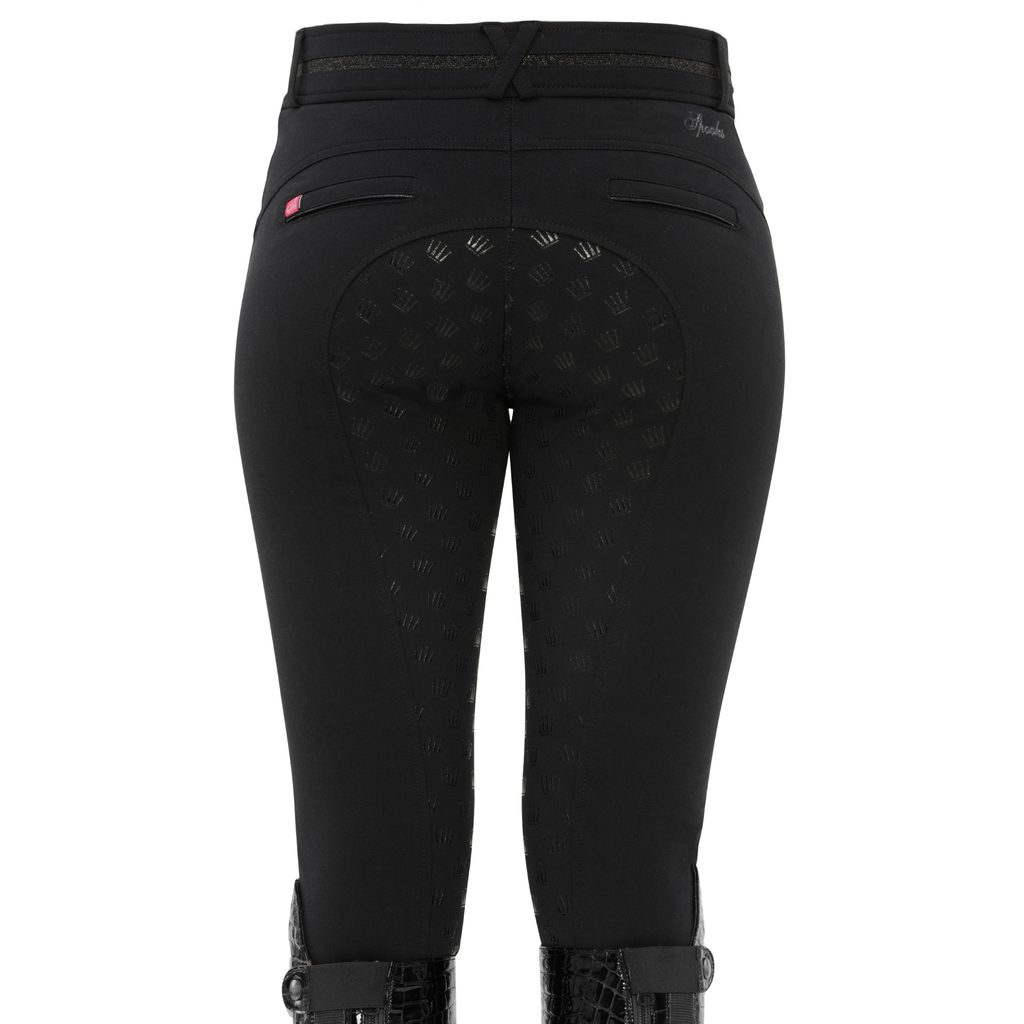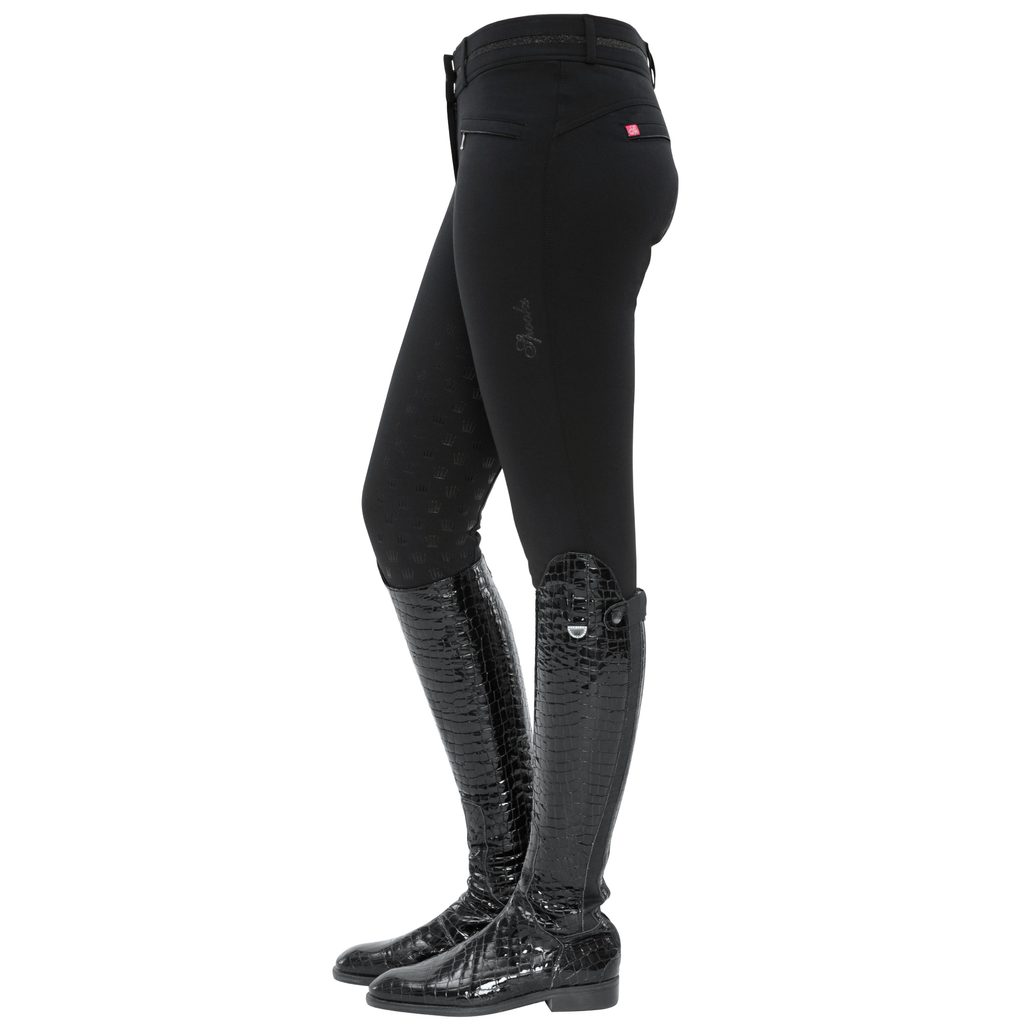 Mají dvě uzavíratelné kapsy na přední straně a ozdobné zadní falešné kapsy. Pas je mírně vyšší, elastický a ponechává prostor pro jakýkoli opasek a perfektně sedí. Kvalitní grip po celém sedu zajišťuje pevné usazení v sedle. Pro snadnější oblékání a svlékání jsou vybaveny elastickými manžetami na nohavicích. Jsou zdobeny zdobí třpytivým pasem, třpytivými detaily na kapsách a logem Spooks.