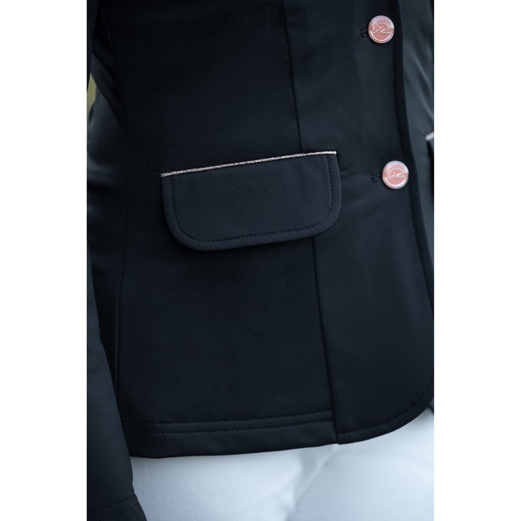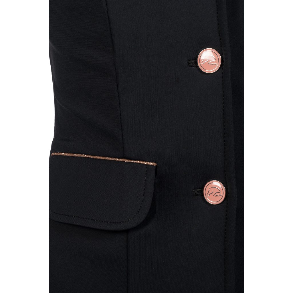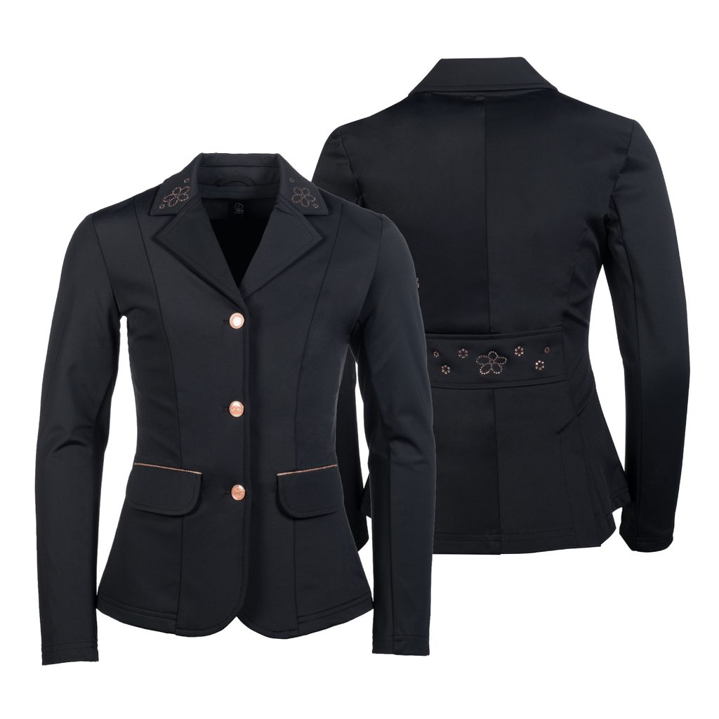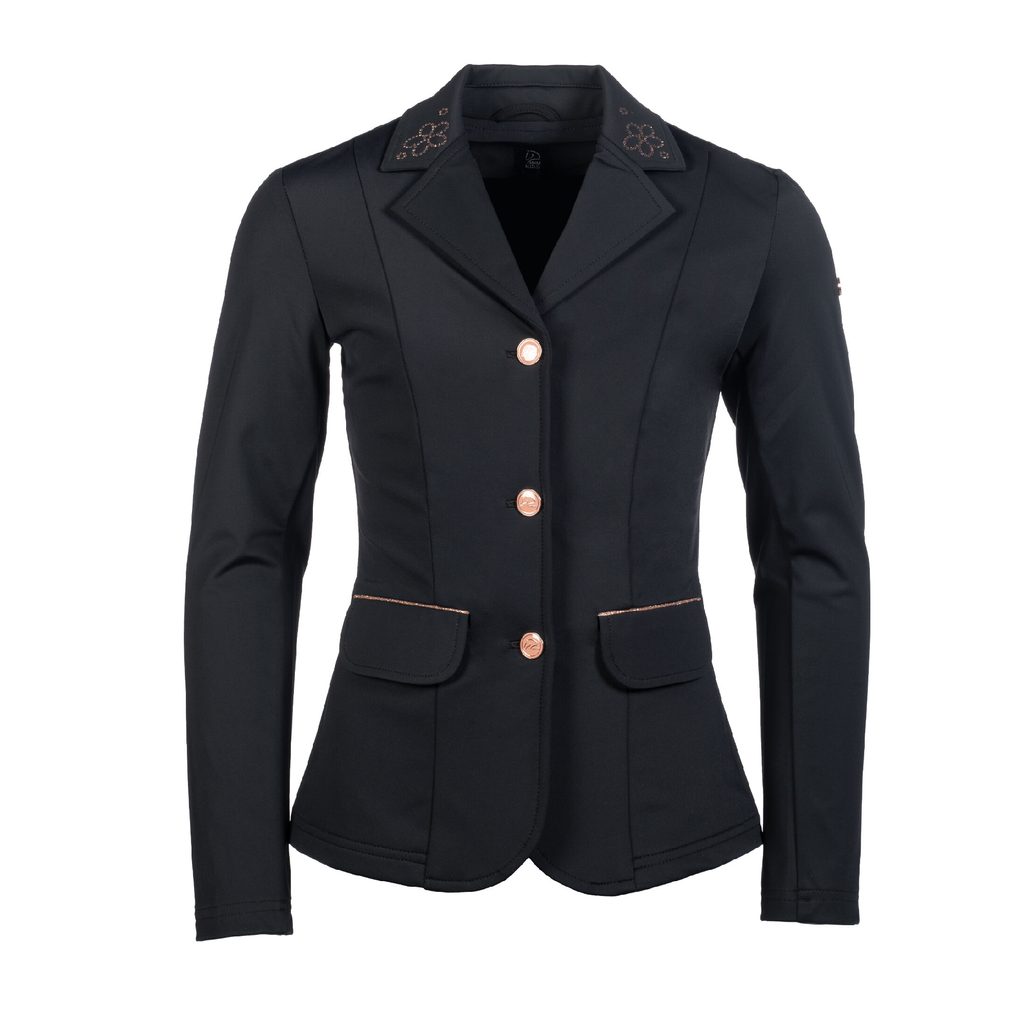 Na první pohled zaujmou jemné rosegold detaily - knoflíky, lemování kapes a kamínkové aplikace ve tvaru kytiček na límci a na bedrech. Sako se zapíná na skrytý zip. K dispozici jsou dvě přední kapsy. Látka je odolná vůči nečistotám, a tak je zajištěn upravený vzhled. Pružná tkanina a dva zadní rozparky umožní příjemnou svobodu pohybu.