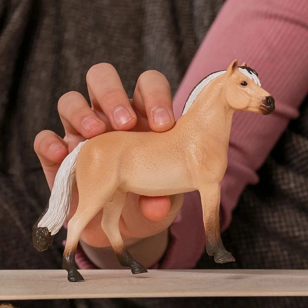 Valacha fjordského koně okamžitě poznáte podle světlé barvy srsti a tmavého hřbetního pruhu podél hřbetu. Dokonce i ocas a hustá hříva jsou dvoubarevné. Jak název napovídá, plemeno pochází z norské skalnaté krajiny fjordů. Díky krátkým a silným nohám jsou pro tenhle terén dokonale vybaveni. Rádi se ale také poflakují ve vaší herně!