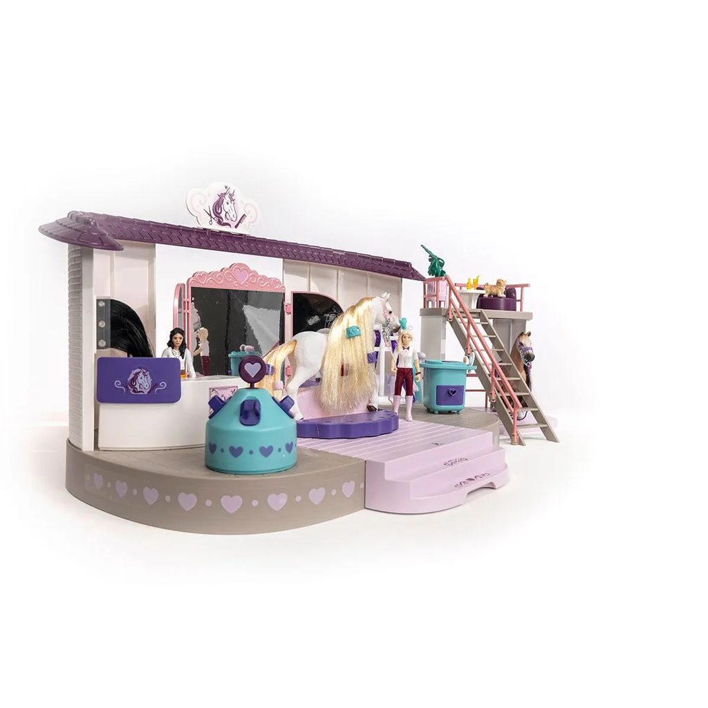 Jejda… S takovou nabídkou je těžké si vybrat: oslava ve stáji, narozeniny koně nebo první školní den nejmladšího hříběte – v Salonu krásy najdeš vše, co si jen můžeš přát pro každou koňskou příležitost. A díky krejčovství si mohou nechat každý doplněk ušít i na míru. Malá hříbata, sportovní poníci i mohutní hřebci tak mohou hrdě předvést své nové oblečení na pódiu. Pod ním najdeš šuplík, do kterého můžeš uložit všechny doplňky do hřívy, sponky a korálky. Víš, že hřívu a ocas každého koně můžeš snadno vyměnit a taky je můžeš kartáčovat? To není špatné, co? A po všem tom pózování si zvířata zaslouží spoustu čerstvého sena v útulné čekárně. K dostání je i skvělá limonáda. Ale ta je tu pouze pro jezdce.