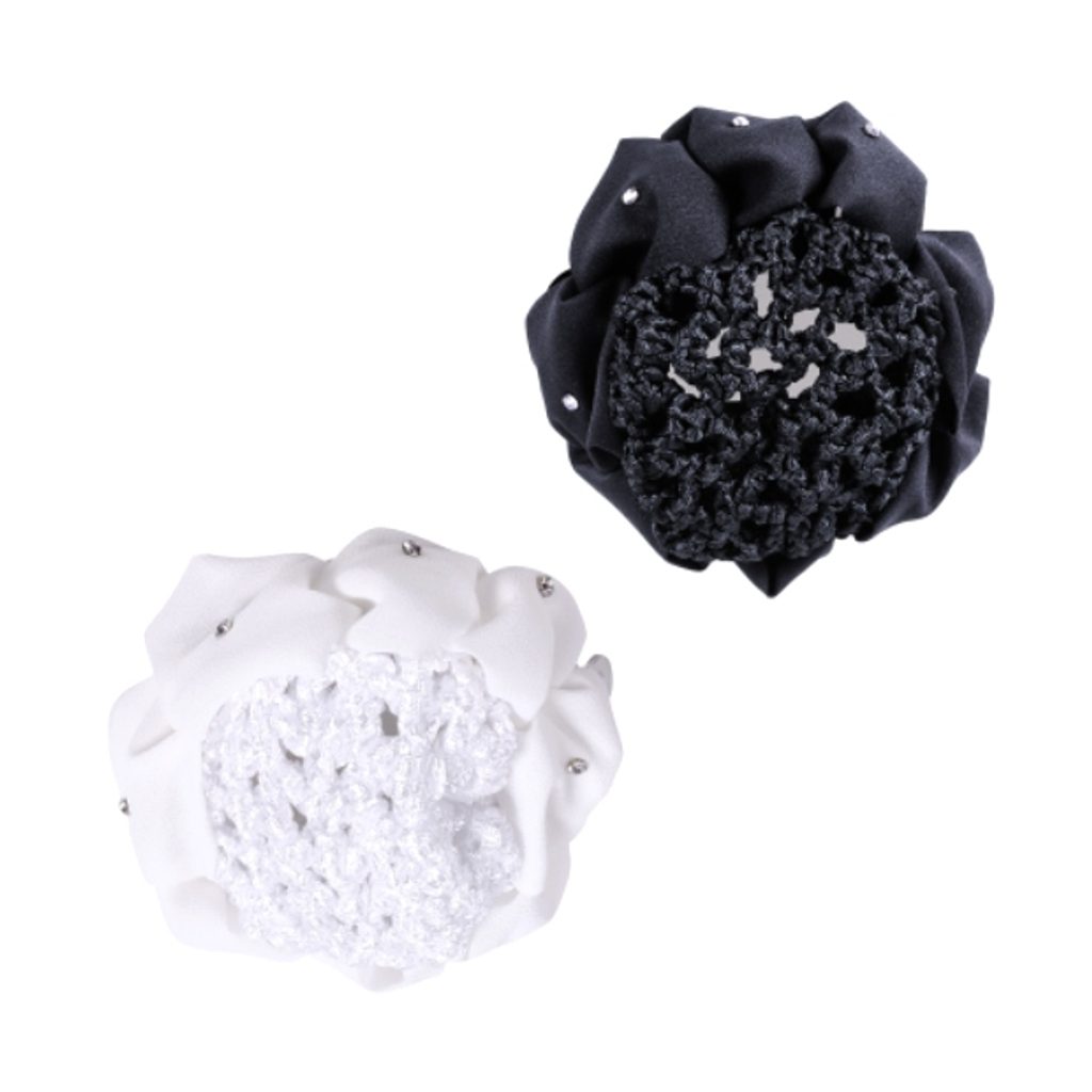 Síťka na vlasy s připevněnou skládanou látkovou gumičkou. Po celém obvodu zdobená drobnými stříbrnými kamínky. Na zadní straně jsou umístěny dva malé skřipce pro upevnění gumičky.