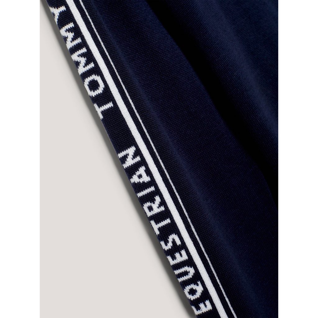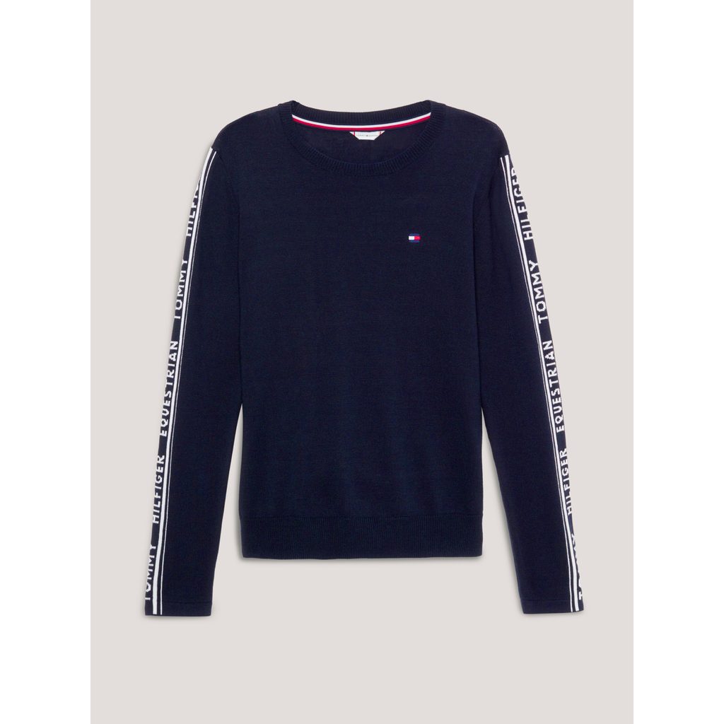 Svetr je zdobený nápisem ''Tommy Hilfiger'' po celé délce rukávů a klasickým logem s malou vlajkou na hrudi. Svetr elegantně doplní každý outfit, ať už do stáje či do civilu.