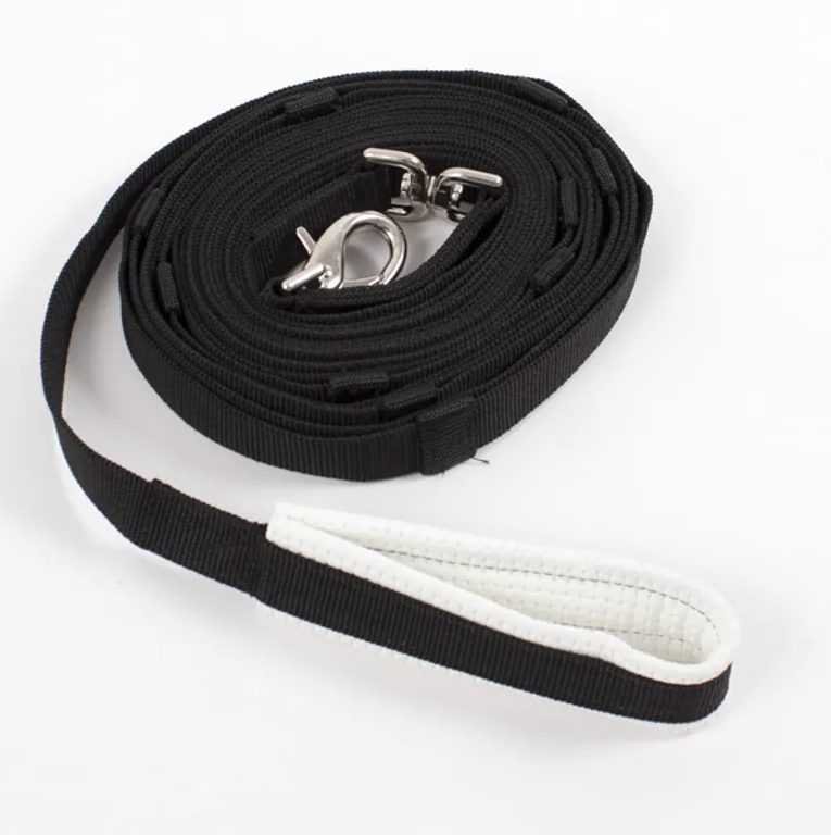 První pomůcka která jistě napadne každého z nás je lonž. Bývá dlouhá 8 - 10m a výběr barev je opravdu velký. V nabídce jsou i různé materiály - měkčí, tvrdší, levnější i dražší.