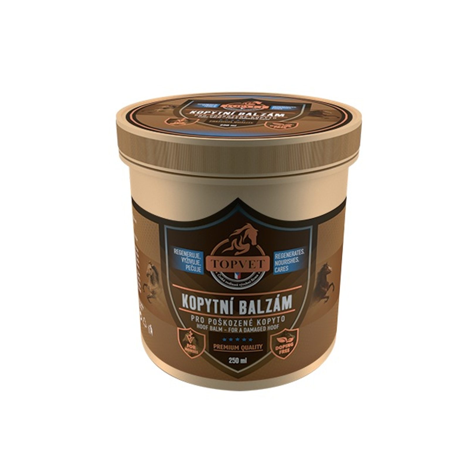 Kopytní balzám je určený pro koně s poškozeným, suchým a lámavým kopytem. Originální receptura kopytní tkáň vyživuje, regeneruje a chrání před agresivním prostředím. Kopyto je po použití zdravé, elastické a připravené na vysokou zátěž. Směs luxusních olejů díky vysokému obsahu nenasycených mastných kyselin přirozeným způsobem vyživuje a regeneruje. Směs vosků kopyto chrání. Bylinná směs dodá kopytu lesk a barvu.