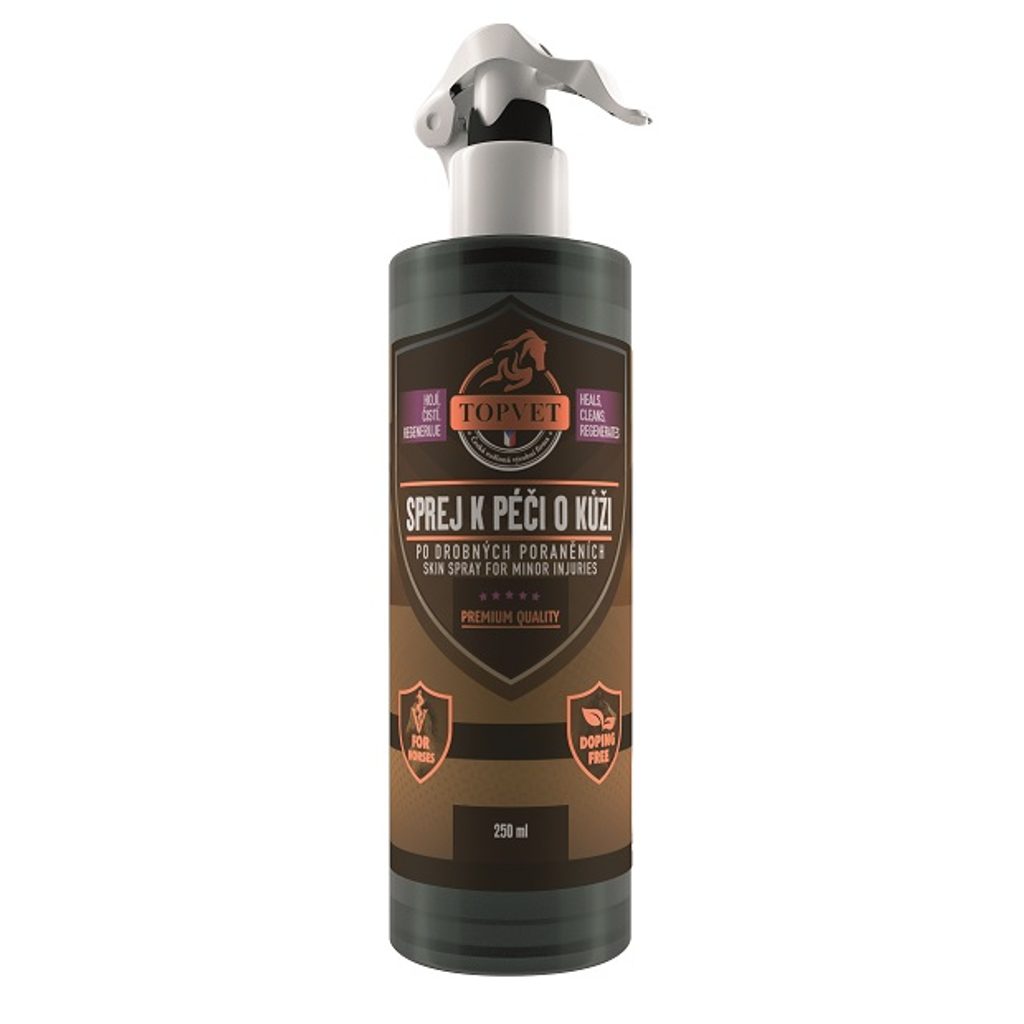SPREJ K PÉČI O KŮŽI PO DROBNÝCH PORANĚNÍCH je určený pro koně. Originální receptura byla vyvinuta k péči o kůži po poškozené tkáni, kterou regeneruje. Bylinná kompozice (tea tree oil, manuka, měsíček, kostival, aloe) vykazuje silný antiseptický a hojivý účinek.