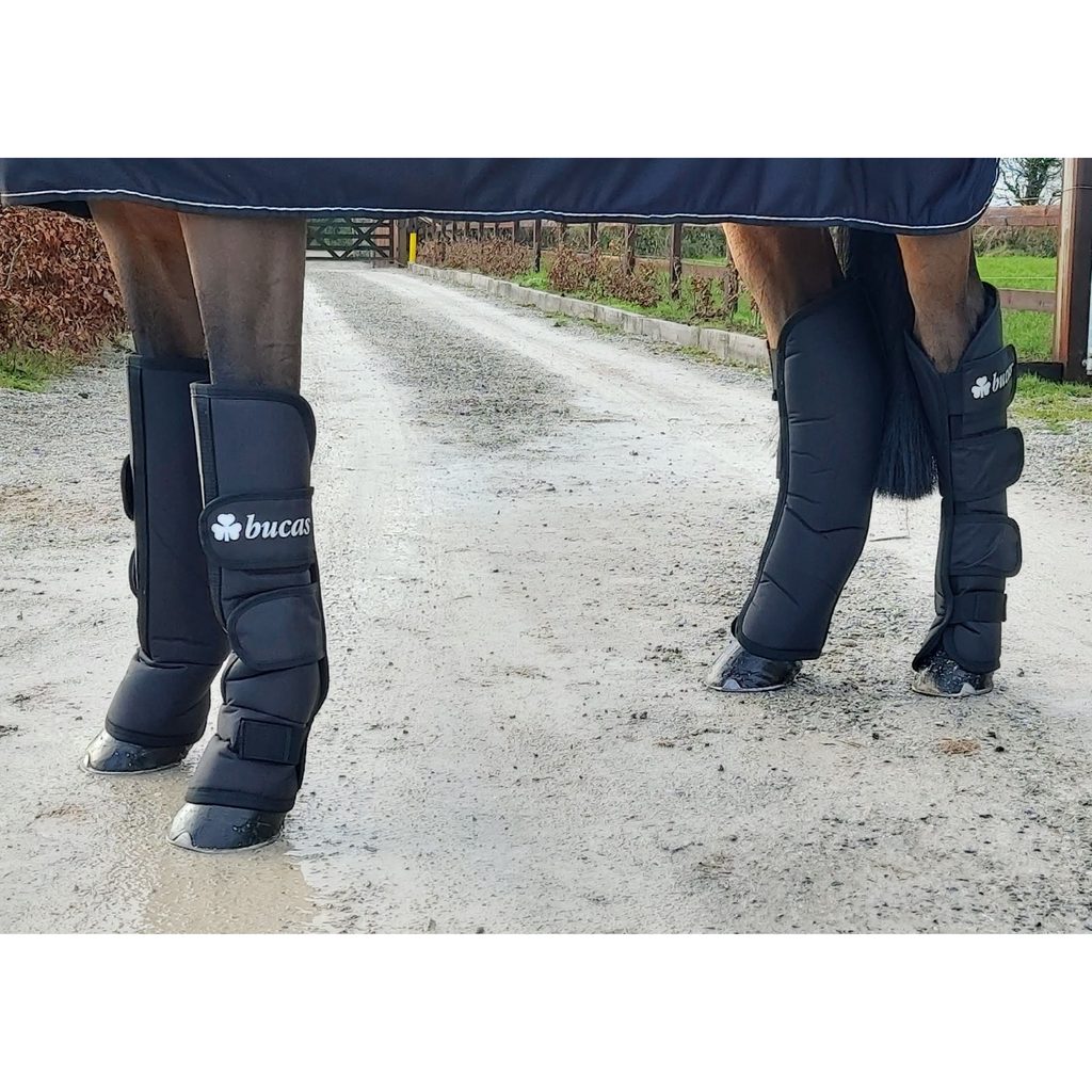 Velmi kvalitní transportní kamaše od irského výrobce Bucas. Vyrobené z odolného vnějšího materiálu a vnitřní podšívka Stay-Dry. Polstrované tak, aby byly koňské noze co nejvíce příjemné. Přední kamaše mají jedinečný způsob zapínání - zapínají se opačně. Přední část je tedy vyšší a dostatečně chrání karpální kloub a zadní část umožní pohodlné ohnutí končetiny. Kamaše perfektně chrání při transportu. Barva: černá. Velikost: Full. Cena za sadu.