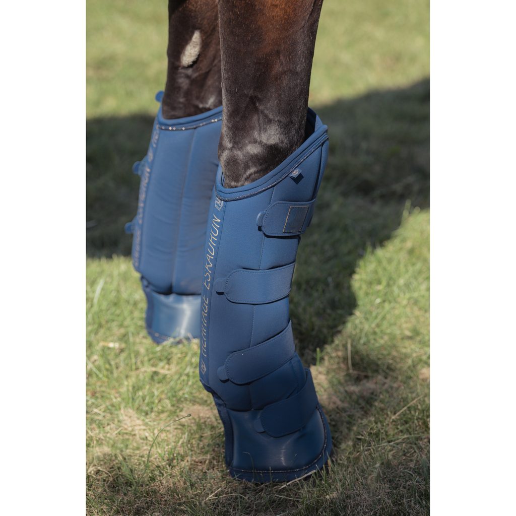 Svrchní materiál z softshellu je odolný vůči opotřebení. Měkká spodní strana z molitanu poskytuje optimální rozložení tlaku a vynikající odpružení, což chrání nohy koně při delších cestách. Kamaše jsou vybaveny několika suchými zipy pro snadné a individuální nastavení, což zaručuje perfektní přizpůsobení. Robustní softshellová výztuha v oblasti kopyta (vpředu a vzadu) poskytuje extra ochranu při nárazech a stresových situacích. Elegantní lurexové lemování a ozdobný potisk Heritage dodávají kamaším luxusní vzhled.