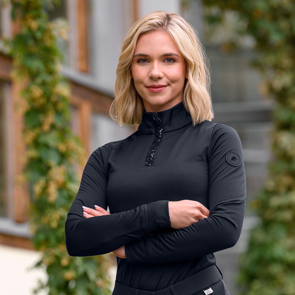 Luxusní detaily, jako je ozdobná léga s třpytivými flitry a logo značky s kamínky dodávají tričku sofistikovaný charakter, který ocení každá jezdkyně se smyslem pro styl.
