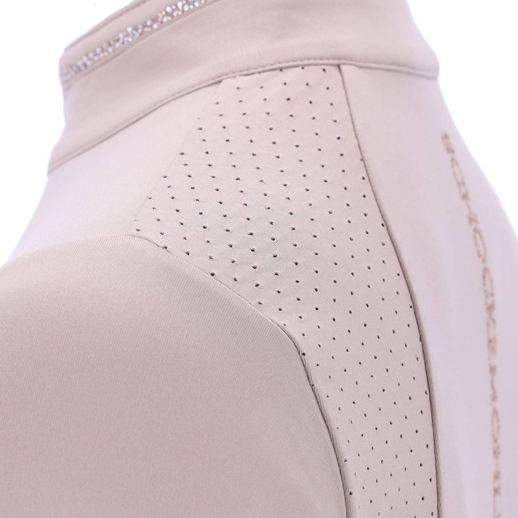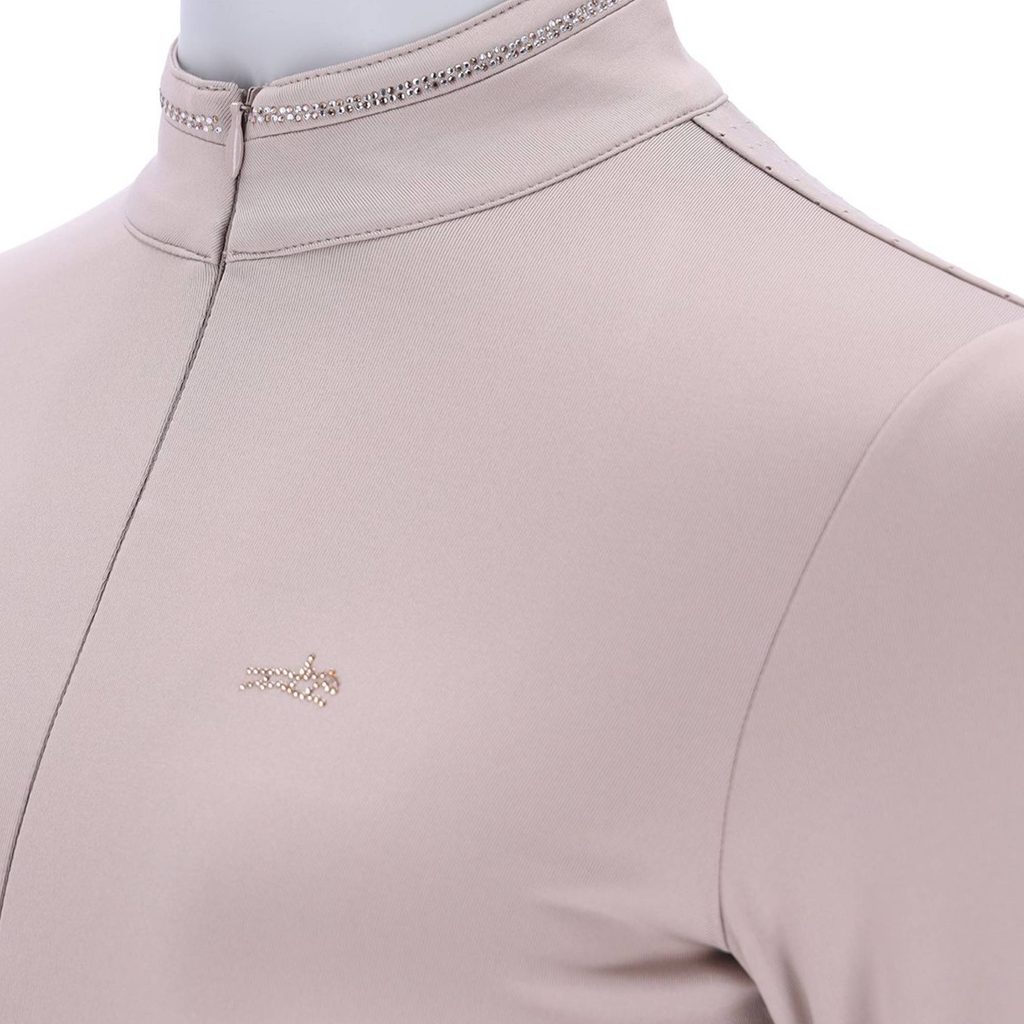 Design doplňuje stojáček zdobený kamínky a jemné logo, které dodávají tričku elegantní a ženský vzhled.