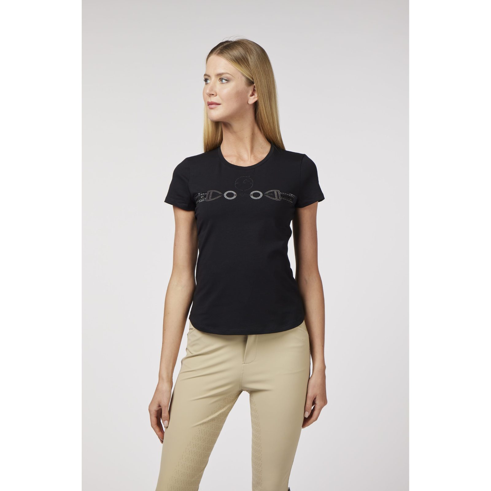 Dámské tričko Vestrum Punta Ala je vyrobeno z kvalitní bi-elastické bavlny, která je prodyšná, příjemná na dotek a dokonale se přizpůsobí pohybu – ideální pro každodenní trénink nebo volnočasové nošení. Na přední straně trička zaujme stylový jezdecký motiv, doplněný jemnými mini cvočky, které dodávají outfitu ženskost a eleganci.