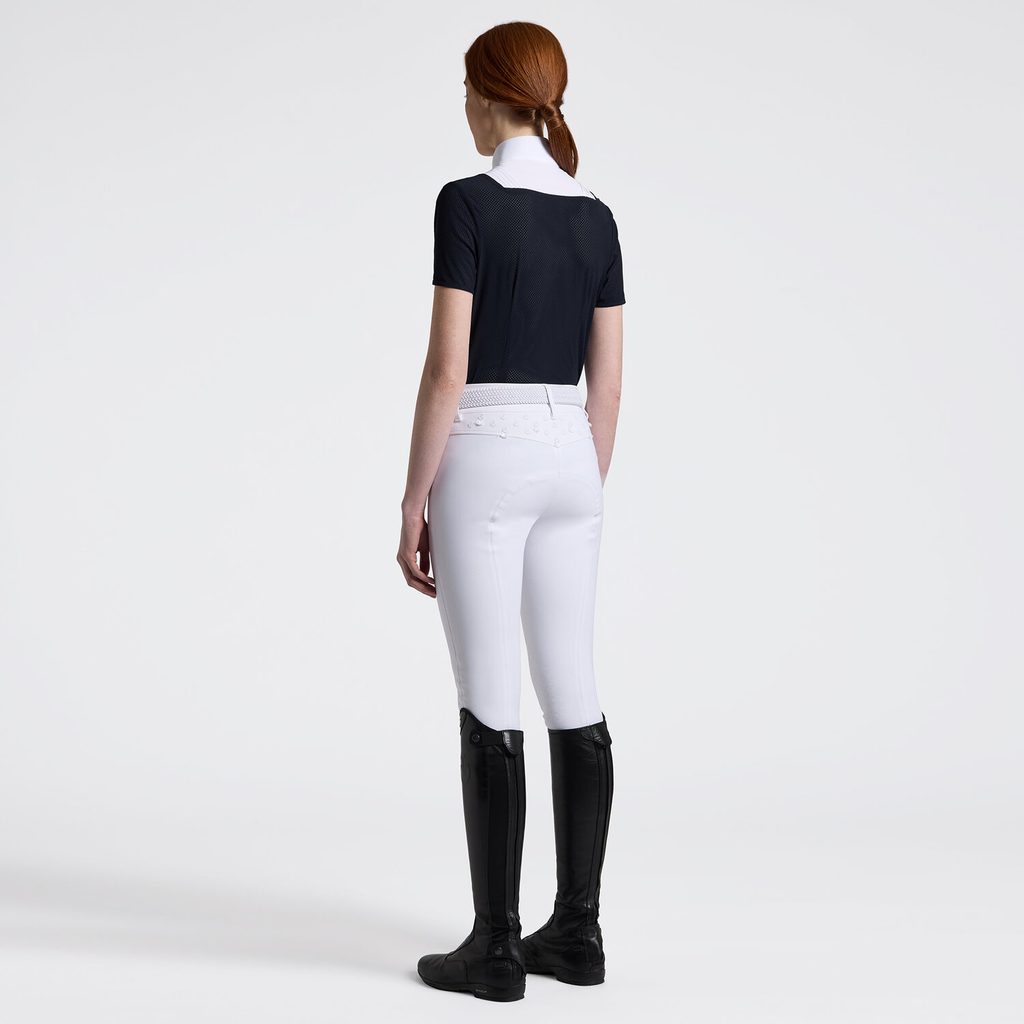 Dámské závodní tričko Cavalleria Toscana American je dokonalou volbou pro jezdkyně, které chtějí na závodech působit upraveně, elegantně a zároveň se cítit maximálně komfortně. Na první pohled zaujme sofistikovaným designem s bílým popelínovým límečkem, zdobenou náprsenkou a skrytým zapínáním na knoflíčky, které vytváří čistý, luxusní a velmi ženský vzhled. Tento model krásně podtrhne jezdeckou siluetu a dodá outfitu profesionální a reprezentativní dojem.