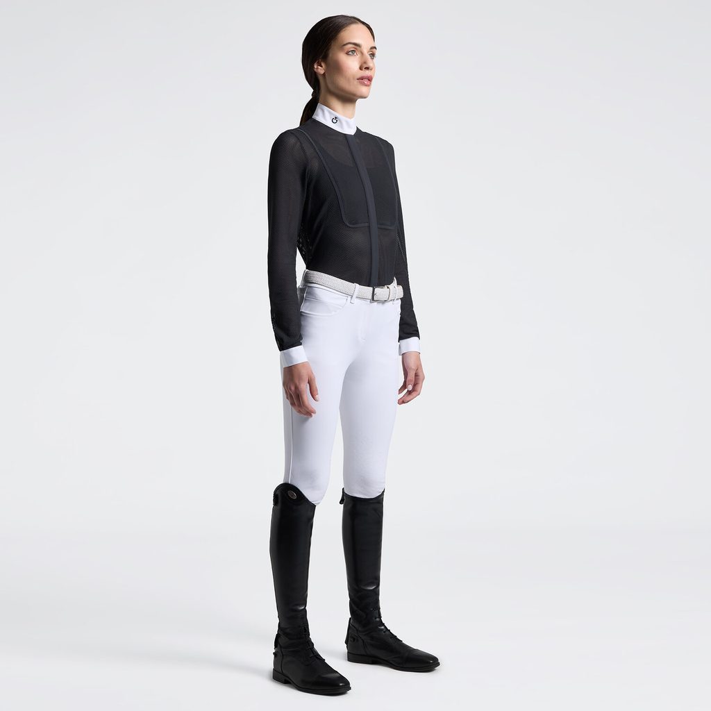 Dámské závodní tričko Cavalleria Toscana Perforated s dlouhým rukávem je ideální volbou pro jezdkyně, které chtějí při závodech spojit vytříbený vzhled s maximálním komfortem. Na první pohled zaujme sofistikovaným designem s vysokým stojáčkem, čistou přední linií a elegantními bílými detaily na manžetách a límci, které dodávají modelu reprezentativní a velmi ženský charakter. Viditelné knoflíčky na rukávech pak přidávají jemný, luxusní detail, který podtrhuje precizní zpracování.