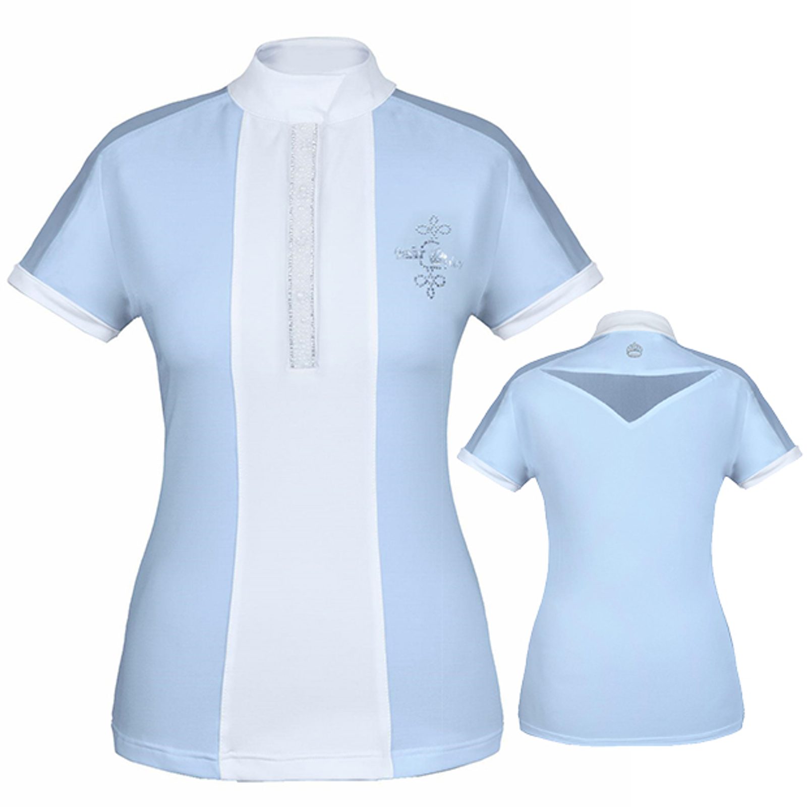 Elegantní závodní tričko vyrobené z pružné, prodyšné technické tkaniny výborně odvádějící vlhkost od těla. Je vybaveno elastickými síťovinovými vložkami na rukávech a zádech, které podporují dokonalou cirkulaci vzduchu. Bílý límeček má skryté přední zapínání. Naprosto výjimečný vzhled díky přednímu panelu zdobenému kamínky a krásnými perličkami. Kamínky zdobené logo Fair Play a třpytivý design korunky na zátylku dodávají tričku naprosto stylový design. Barva: sv.modrá. Velikosti: XS, S, M.