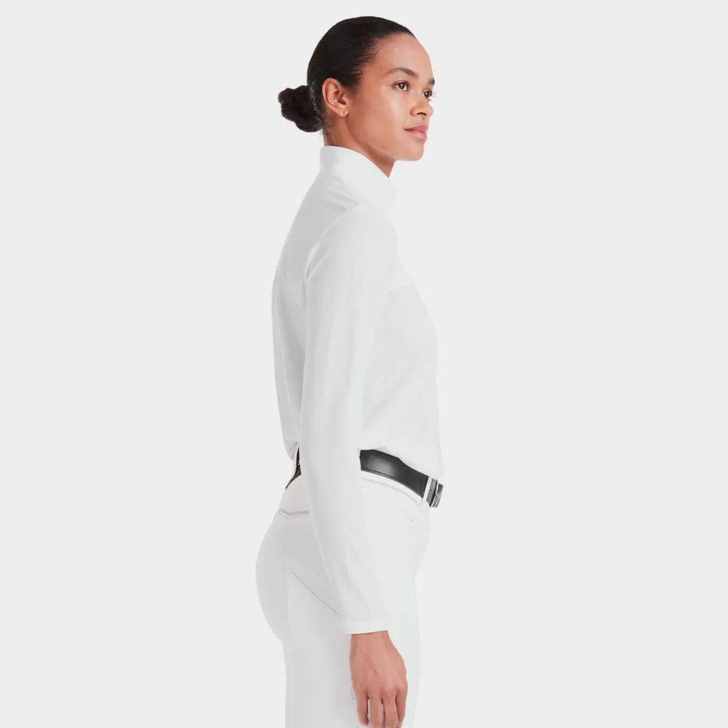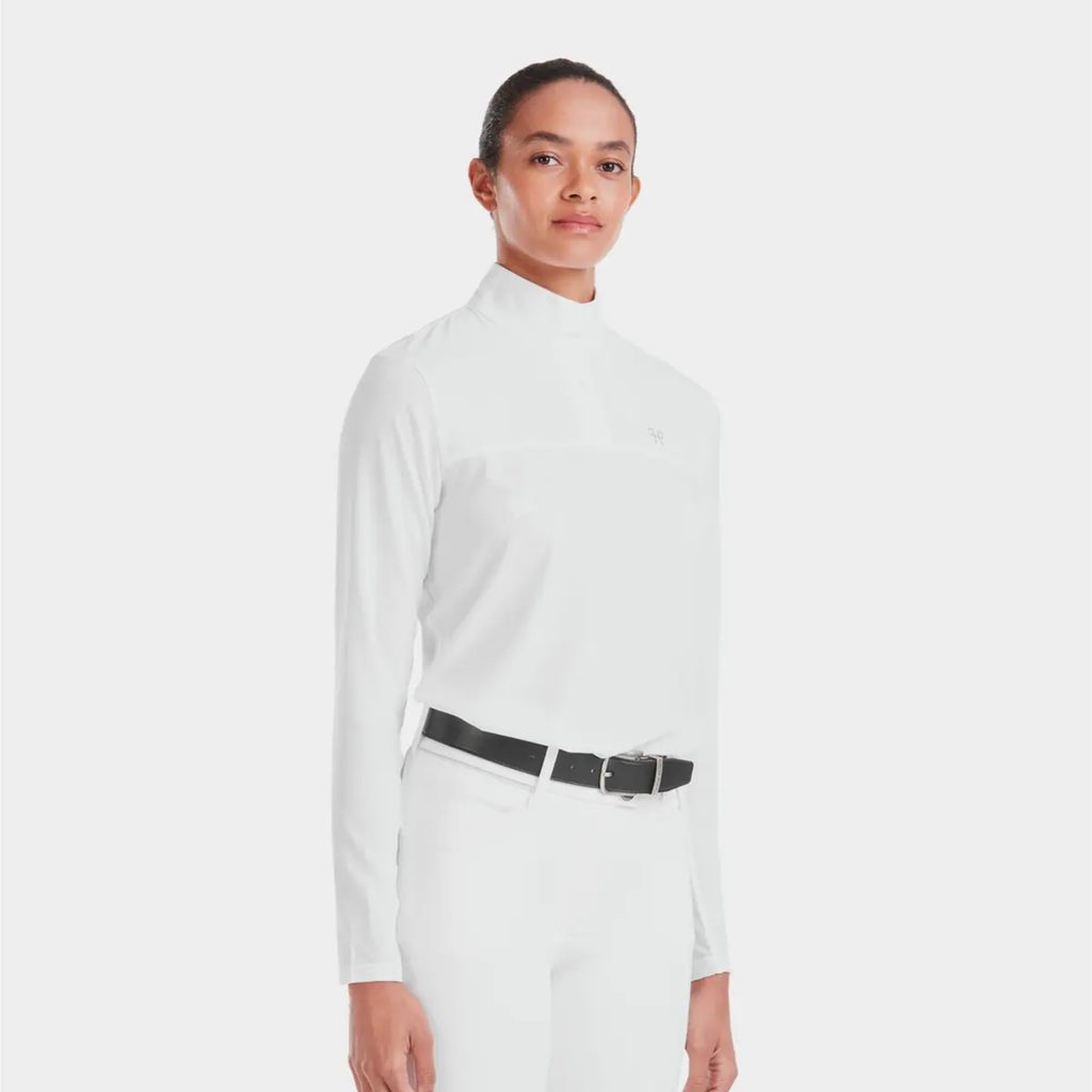 Navrženo speciálně pro jezdkyně, které chtějí vypadat elegantně a zároveň si užít maximální pohodlí během tréninku i závodů. Tričko má volnější střih, elegantní límeček ve stylu košile a praktické zapínání na zip a cvoček.