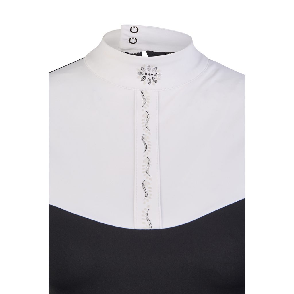 Toto elegantní funkční tričko poskytuje díky prodyšnému materiálu lehkost a pohodlí. Rukávy jsou z jemného prodyšného síťovaného materiálu, který umožňuje dostatečnou ventilaci. Záda zdobí malý kapkovitý výstřih. Stojáček se zapíná na druky, tím je umožněno snadné oblékání. Luxusní kamínková aplikace se nachází na manžetách, stojáčku a hrudníku. Dalším stylovým prvkem je potisk na zádech pod výstřihem.