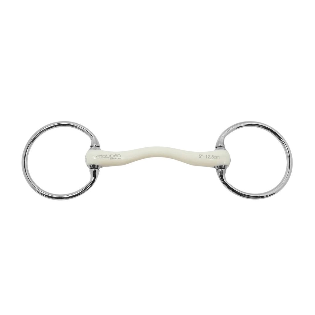 Skrytá kovová výztuha zajišťuje maximální bezpečnost a odolnost proti zlomení, zatímco menší port na jazyku snižuje tlak a podporuje lepší přijetí udidla. Olivové kroužky zabraňují skřípnutí v koutcích huby a poskytuje vyšší boční stabilitu, takže udidlo sedí klidněji a pomáhá přesnějšímu vedení.
