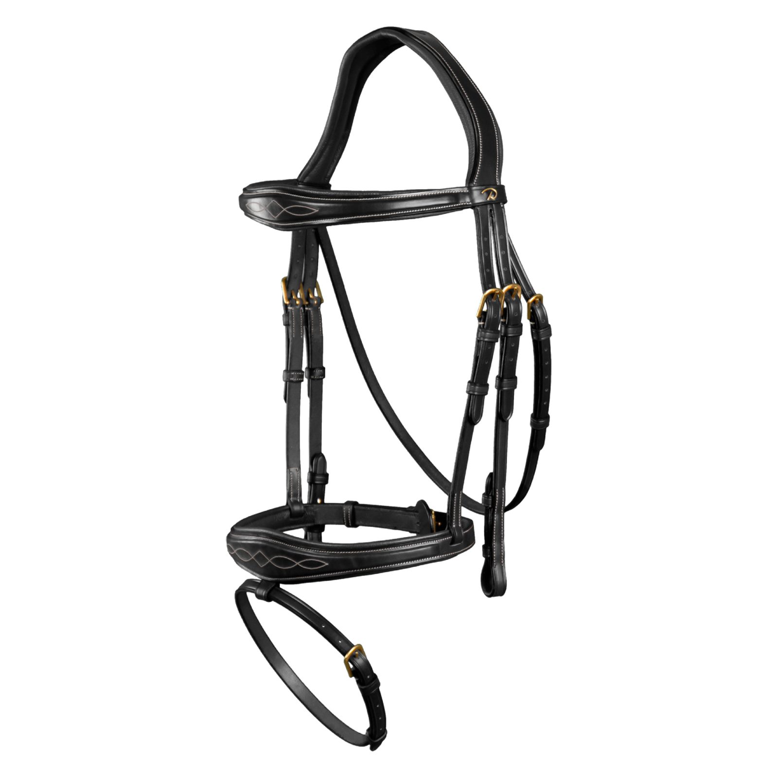 Uzdečka s tradičním anglickým kombinovaným nánosníkem od Dy'on z modelové řady Dy'on Classic. Exkluzivní provedení uzdečky z vysoce kvalitní anglické kůže s anatomickým tvarováním nánosníku, čelenky a nátylníku. Vše měkce podloženo pro maximální komfort koně. Elegantní kontrastní prošívání v krémové barvě a bombírování podtrhuje celkový luxusní vzhled. Mosazné kování. Barva: černá, hnědá. Velikost: Pony, Cob, Full.