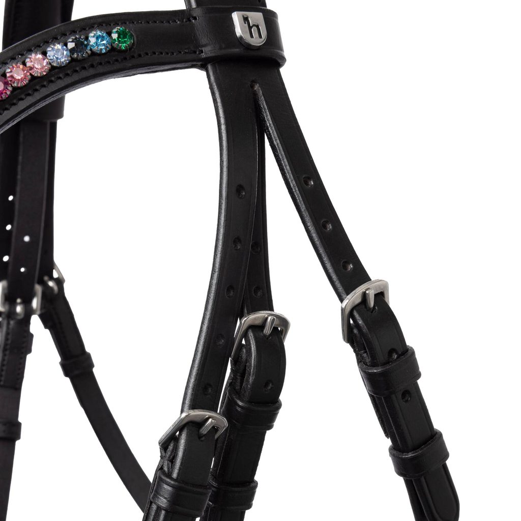 Bez problému kombinuje styl a komfort. Vyznačuje se nápadnou duhovou čelenkou, která dodá vašemu ponymu jedinečný vzhled. Nátylník je velmi měkce polstrovaný, zajistí optimální pohodlí a předchází tlakovým bodům. Vysoce kvalitní kování zaručuje dlouhou životnost. Podpínka je velmi snadno odnímatelná.