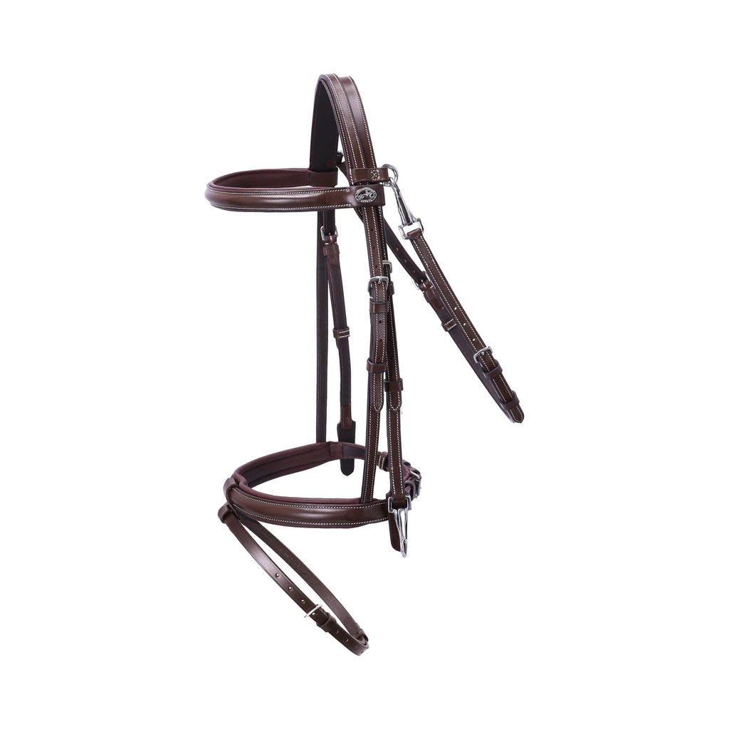 Je vyrobena z vysoce kvalitní buvolí kůže s kontrastním prošitím. Lícnice jsou zakončeny karabinkami pro rychlou výměnu udidla, podhrdelník se také zapíná na karabinky. Anglický nánosník má odnímatelný podpínací řemínek, jeho popruh je veden shora přes nátylník, a tak zajišťuje koni pohodlí a nikde netlačí.
