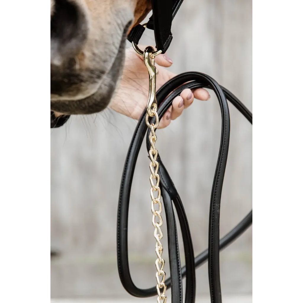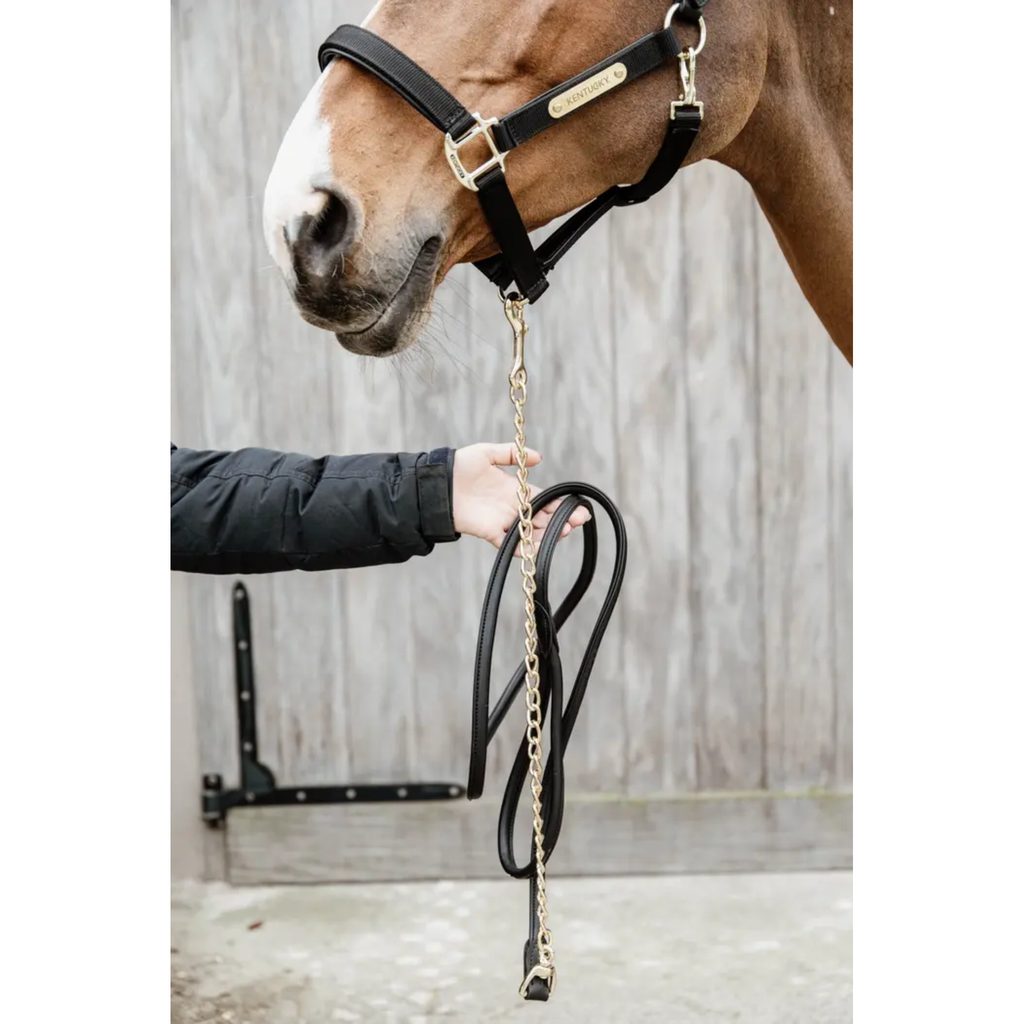 Kožené vodítko Kentucky s řetízkem je ideální pro každodenní manipulaci s koněm i jeho prezentaci například na závodech nebo výstavách. Díky kombinaci syntetické kůže a pevného řetízku nabízí nejen elegantní vzhled, ale také lepší kontrolu při vedení koně.