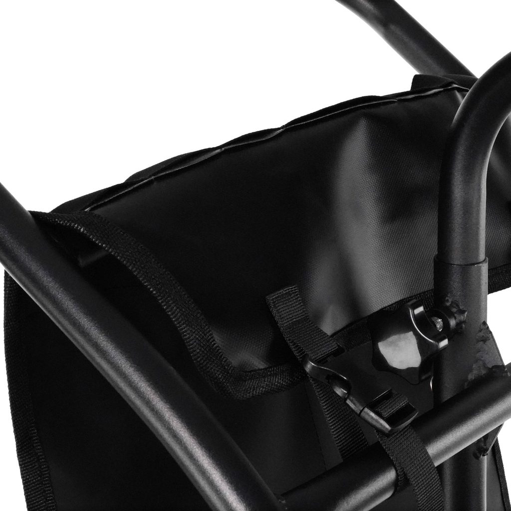 Vozík je vybaven dvěma držáky na sedla s nosností až 30 kg, odnímatelným košem a závěsným kapsářem na čištění s kapsami a síťkami pro drobné potřeby. Tři velká kolečka a brzda zajišťují výbornou stabilitu i snadnou manipulaci na různých površích. Po složení zabírá minimum místa, což oceníte při skladování i přepravě.