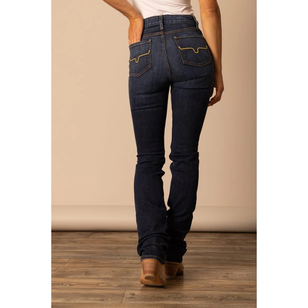 Džíny jsou vyrobeny z inovativního tri-blend denimu, který zajišťuje vysokou pružnost, odolnost a schopnost vracet se do původního tvaru i při častém nošení. Tmavý, zeštíhlující odstín denimu je doplněn jemnými ručně broušenými detaily. Ikonické logo Longhorn v zářivě žluté barvě na zadních kapsách a nad pravou přední kapsou dodává džínům nezaměnitelný charakter značky Kimes Ranch.