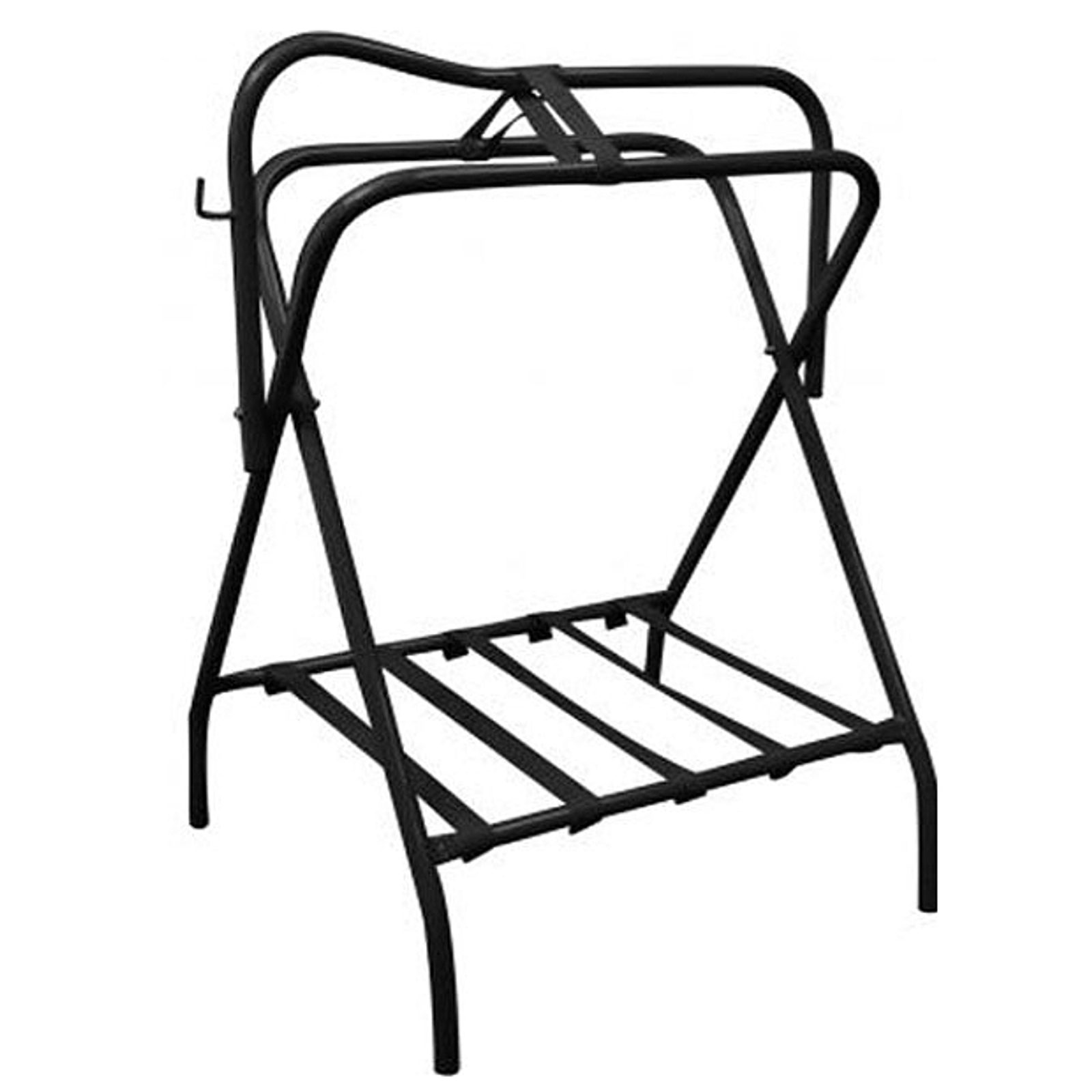 Lehký skládací stojan na sedlo je vyroben z odolných ocelových trubek s vysokou pevností. Drátěná mřížka ve spodní části zpevňuje stojan v rozloženém stavu a kolečka umožňují snadnou mobilitu.