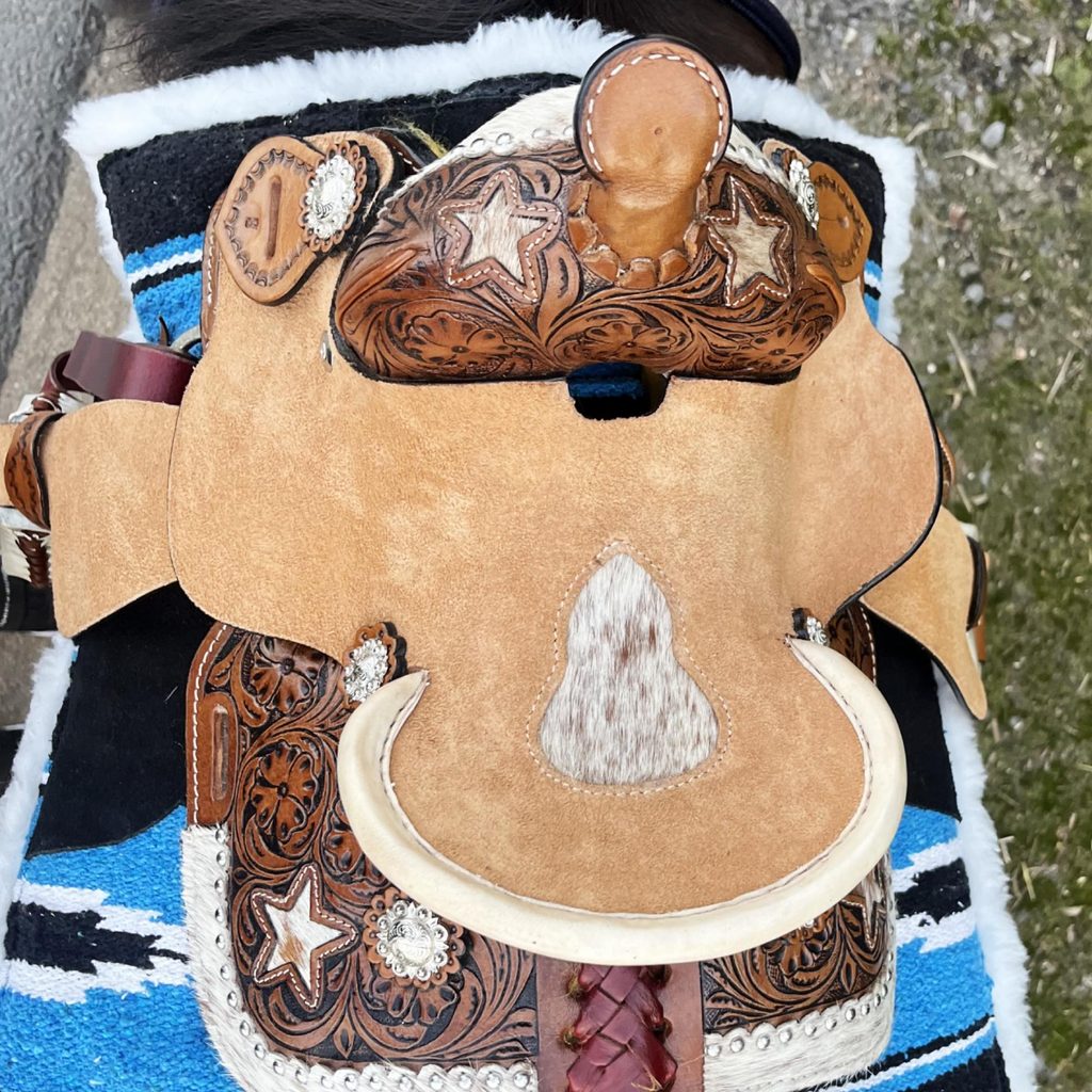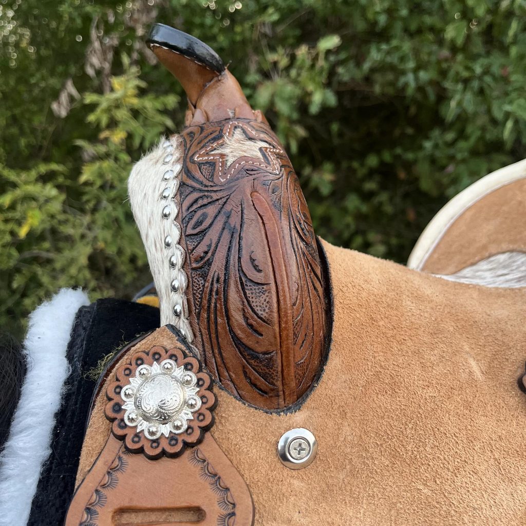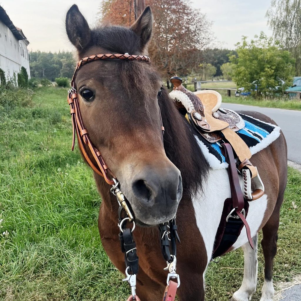 Vyrobeno exkluzivně pro Equiservis. Vhodné pro shetty, minishetty a další typy těch nejmenších poníků a jejich jezdců. Je vyrobeno z velice kvalitní kůže, která je doplněna tradičním ručním zdobením ornamenty s pomocí raznic, přírodním chlupem a ručně zušlechtěnými conchy. Motiv hvězdiček dodává velmi roztomilý vzhled. Je vybaveno hlubším a protiskluzovým posedlím, které vašim ratolestem zajišťuje optimální stabilitu v sedle. Ze spodní strany se nachází beránek. Délka třmenů je nastavitelná.