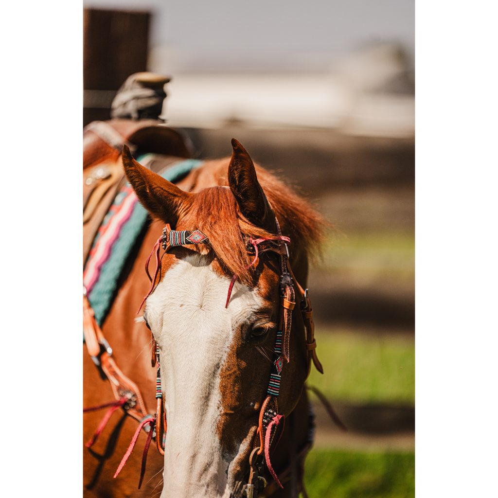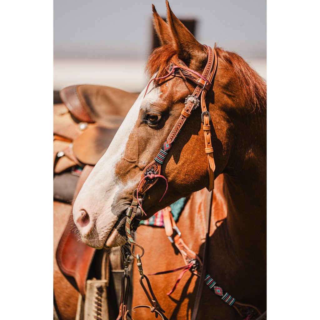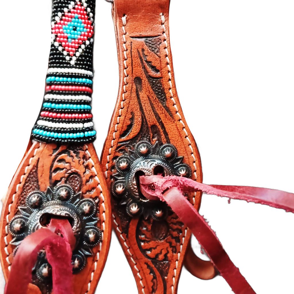 Tato elegantní westernová uzdečka s poprsníkem Cassini Beads vyniká propracovaným designem, který spojuje tradiční koženou ražbu s dekorativním opletem z barevných korálků. Výsledkem je jedinečný a harmonický celek, který osloví každého milovníka westernového stylu.