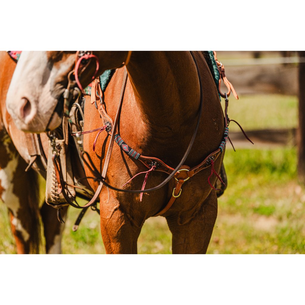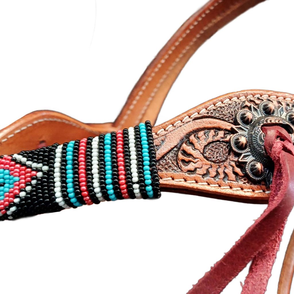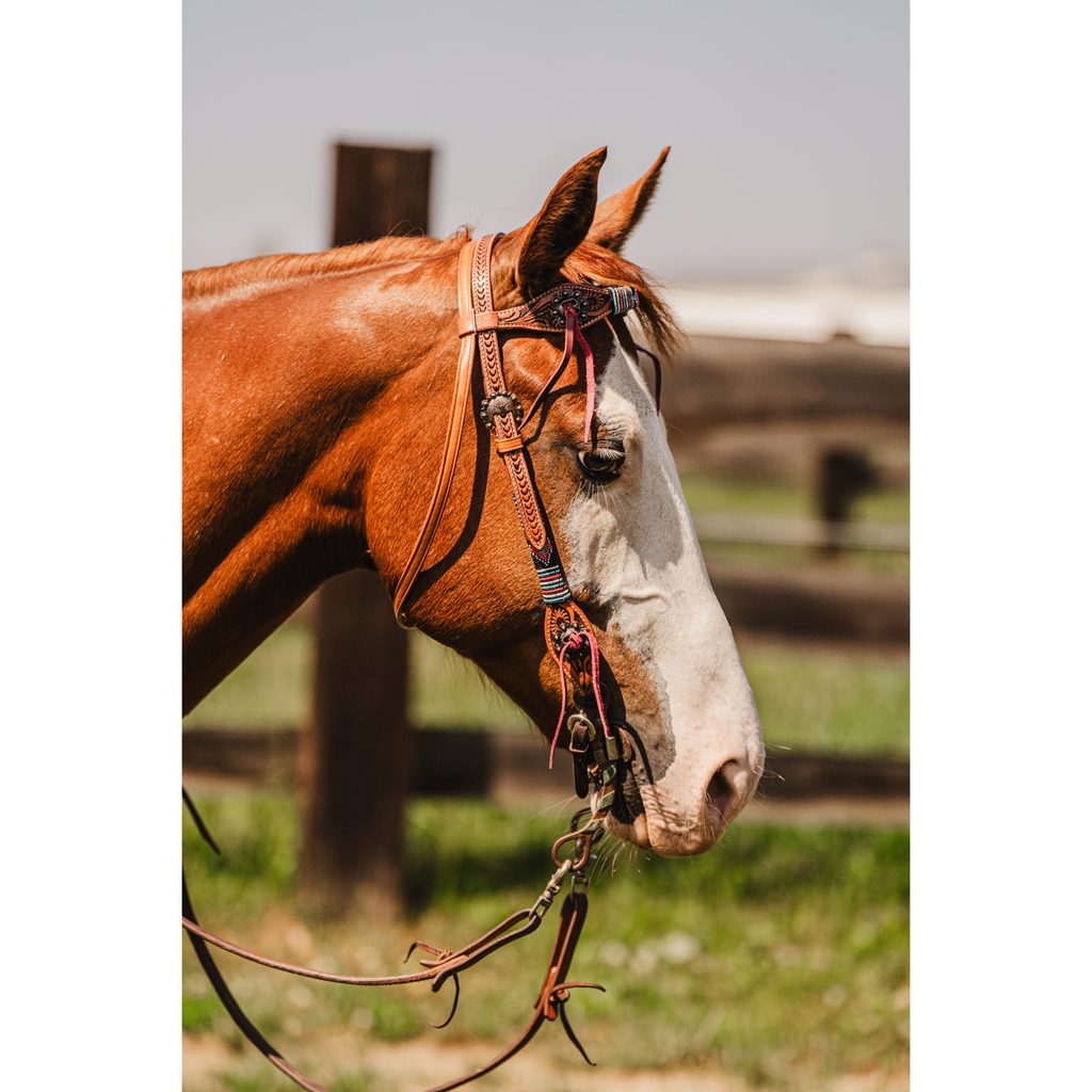Tato elegantní westernová uzdečka s poprsníkem Cassini Beads vyniká propracovaným designem, který spojuje tradiční koženou ražbu s dekorativním opletem z barevných korálků. Výsledkem je jedinečný a harmonický celek, který osloví každého milovníka westernového stylu.
