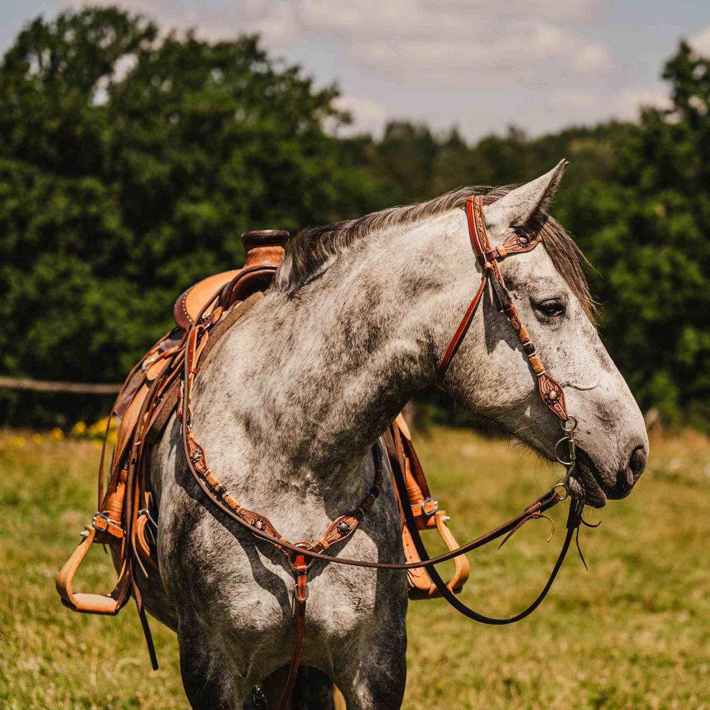 Velmi precizně zpracovaná sada westernové uzdečky s poprsníkem od privátní značky Cassini.