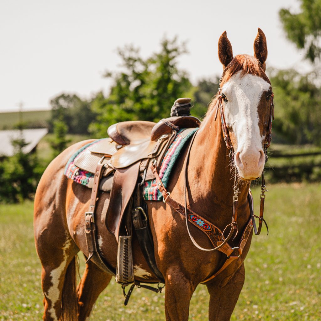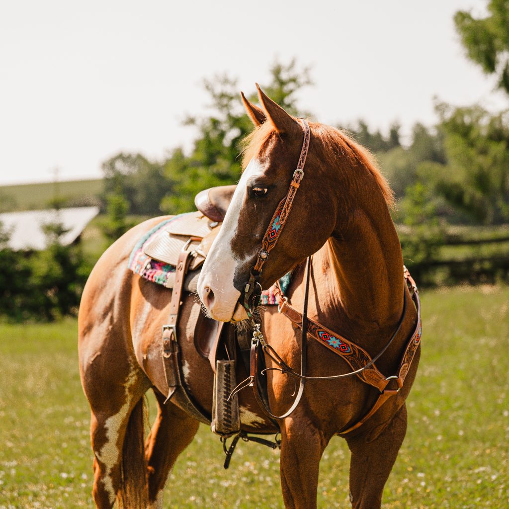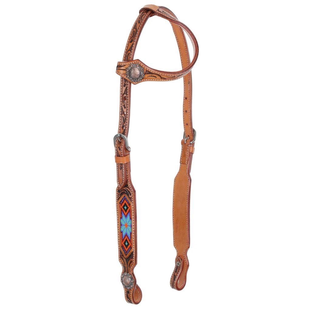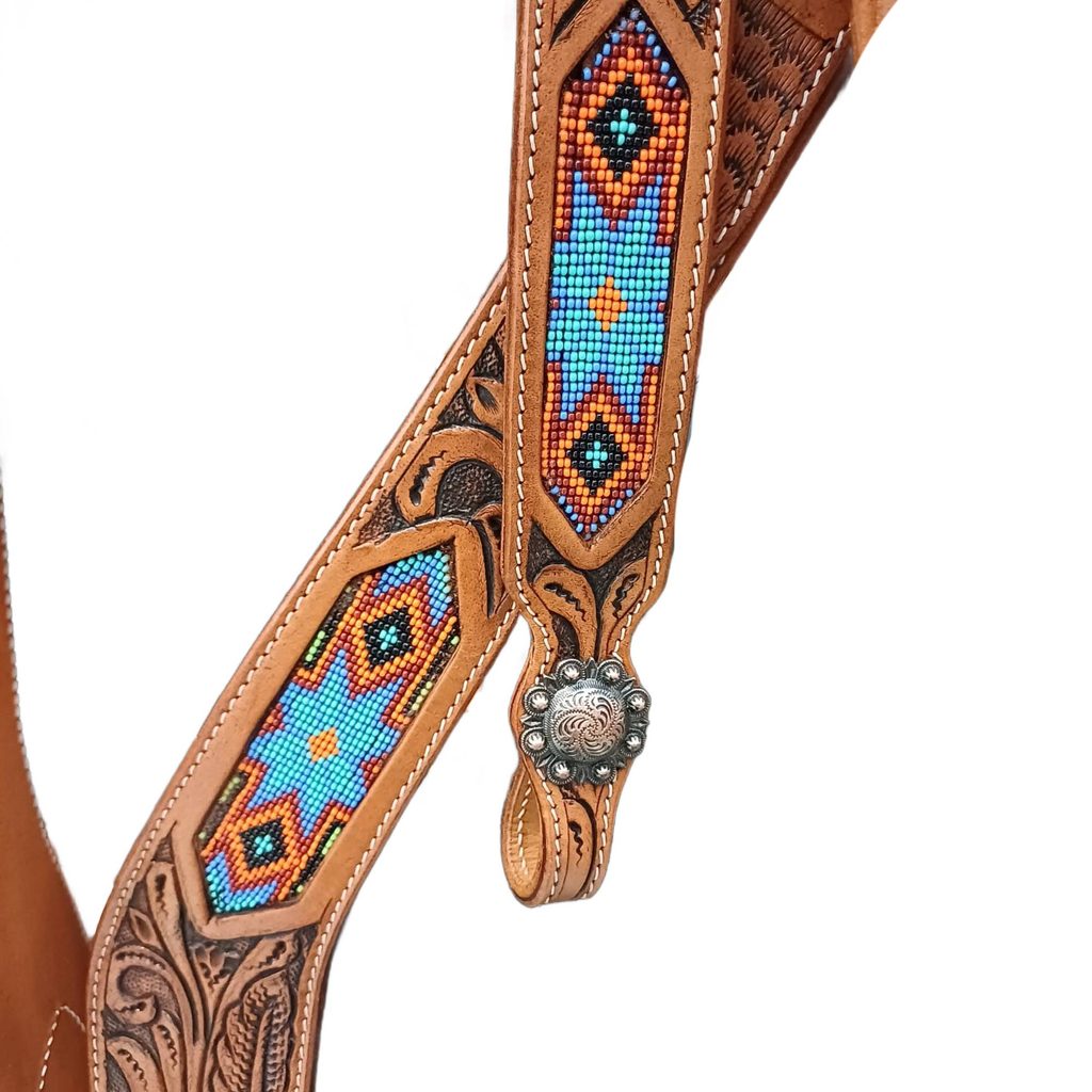 Stylový set Cassini Lucky v sobě spojuje tradiční westernový charakter s precizním ručním zpracováním. Uzdečka i poprsník jsou bohatě zdobené barevnými korálky a vyřezávanými vzory, které dodávají výstroji osobitý a výrazný vzhled.