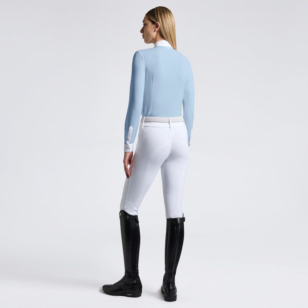 Tento sofistikovaný kousek je navržen pro náročné jezdkyně, které hledají nejen špičkový výkon, ale také stylový vzhled na kolbišti. Lehká, prodyšná a elastická tkanina zajišťuje maximální komfort a volnost pohybu. Jemné plisování na přední části dodává tričku sofistikovaný vzhled vhodný pro závody. Udrží vás v suchu a pohodlí i během náročných výkonů. Stojáček se skrytým zapínáním pro čistý a elegantní vzhled. Materiál je odolný proti zmačkání, zachová si svůj luxusní vzhled i po opakovaném praní.